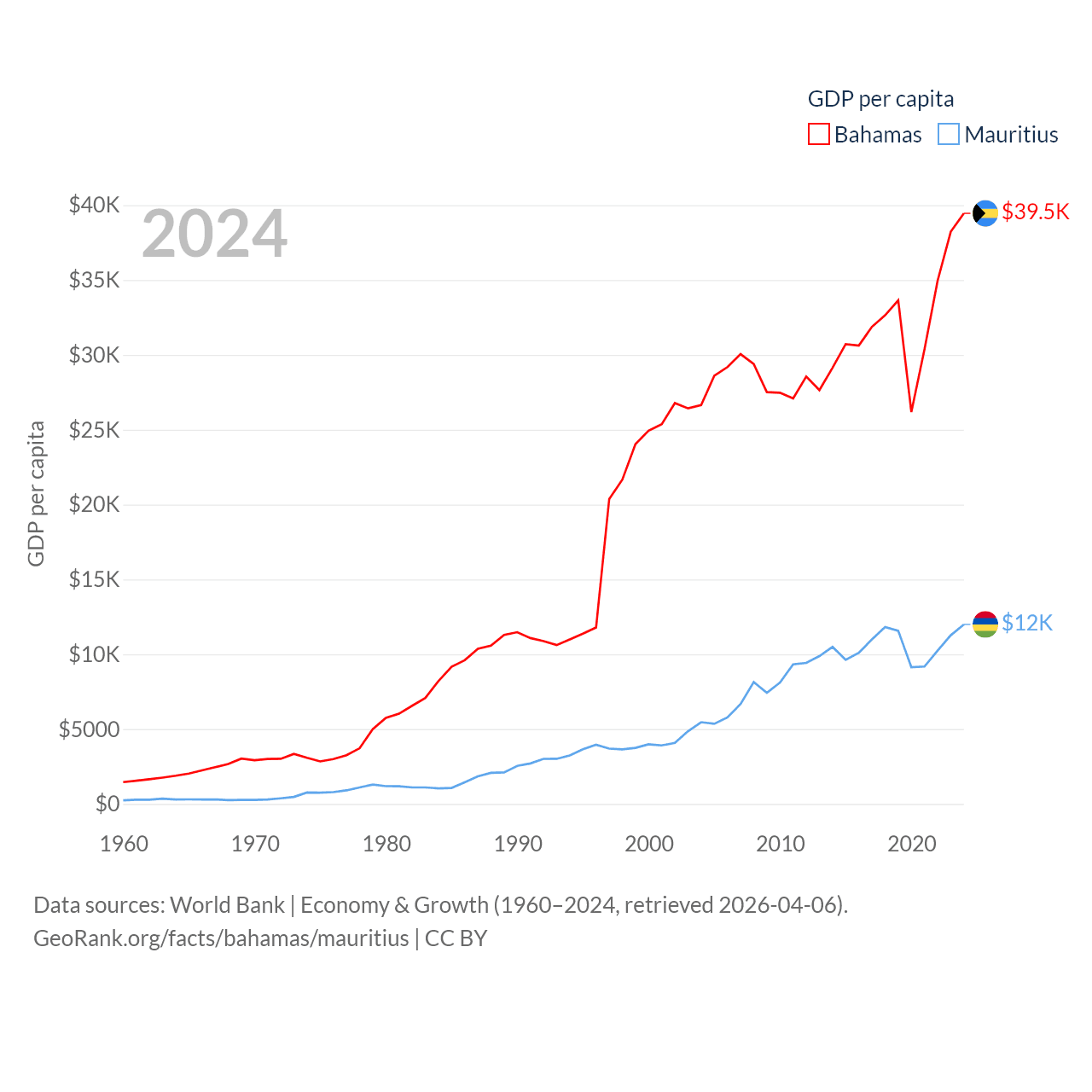 By GDP, The Bahamas ranks 140/197 ($15.8B) and Mauritius ranks 143/197 ($14.9B). By GDP per capita, The Bahamas ranks 30/197 ($39,455), while Mauritius ranks 78/197 ($11,991).