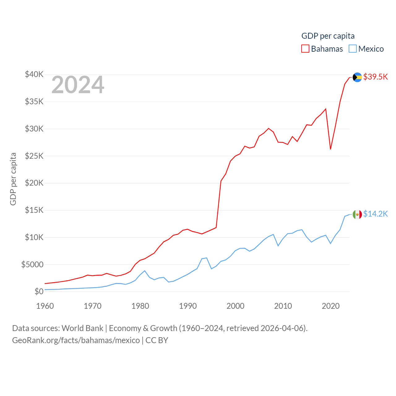 By GDP, The Bahamas ranks 140/197 ($15.8B) and Mexico ranks 13/197 ($1.86T). By GDP per capita, The Bahamas ranks 30/197 ($39,455), while Mexico ranks 69/197 ($14,186).
