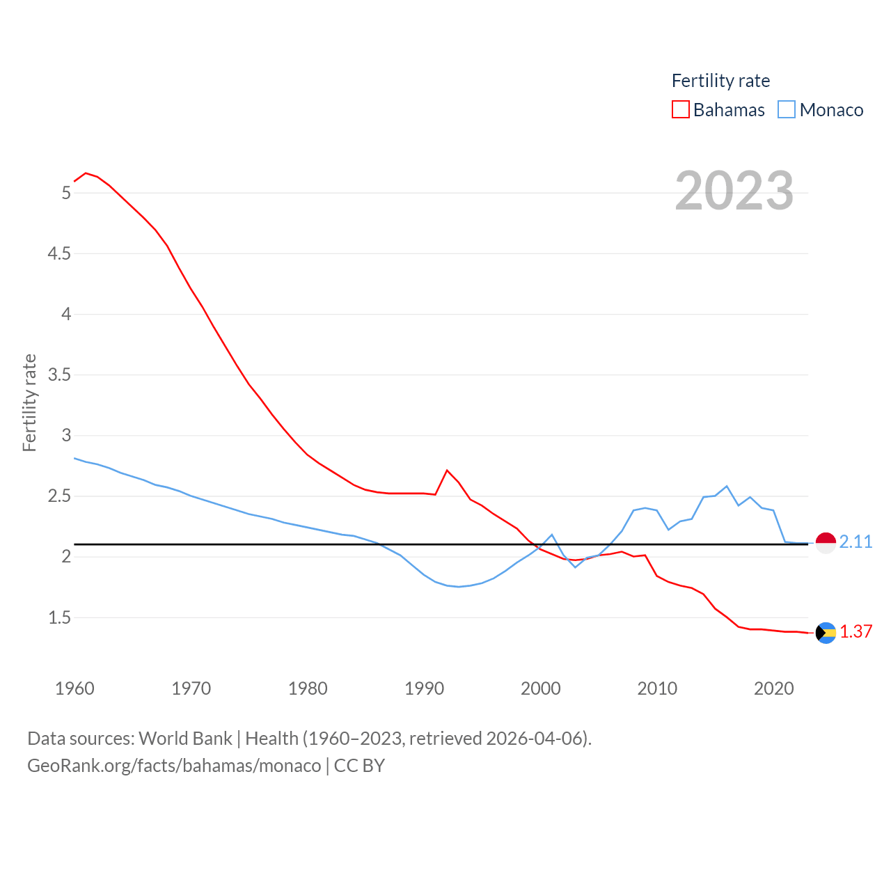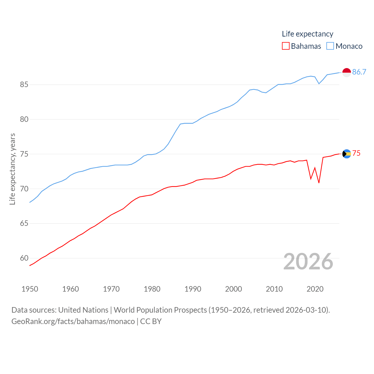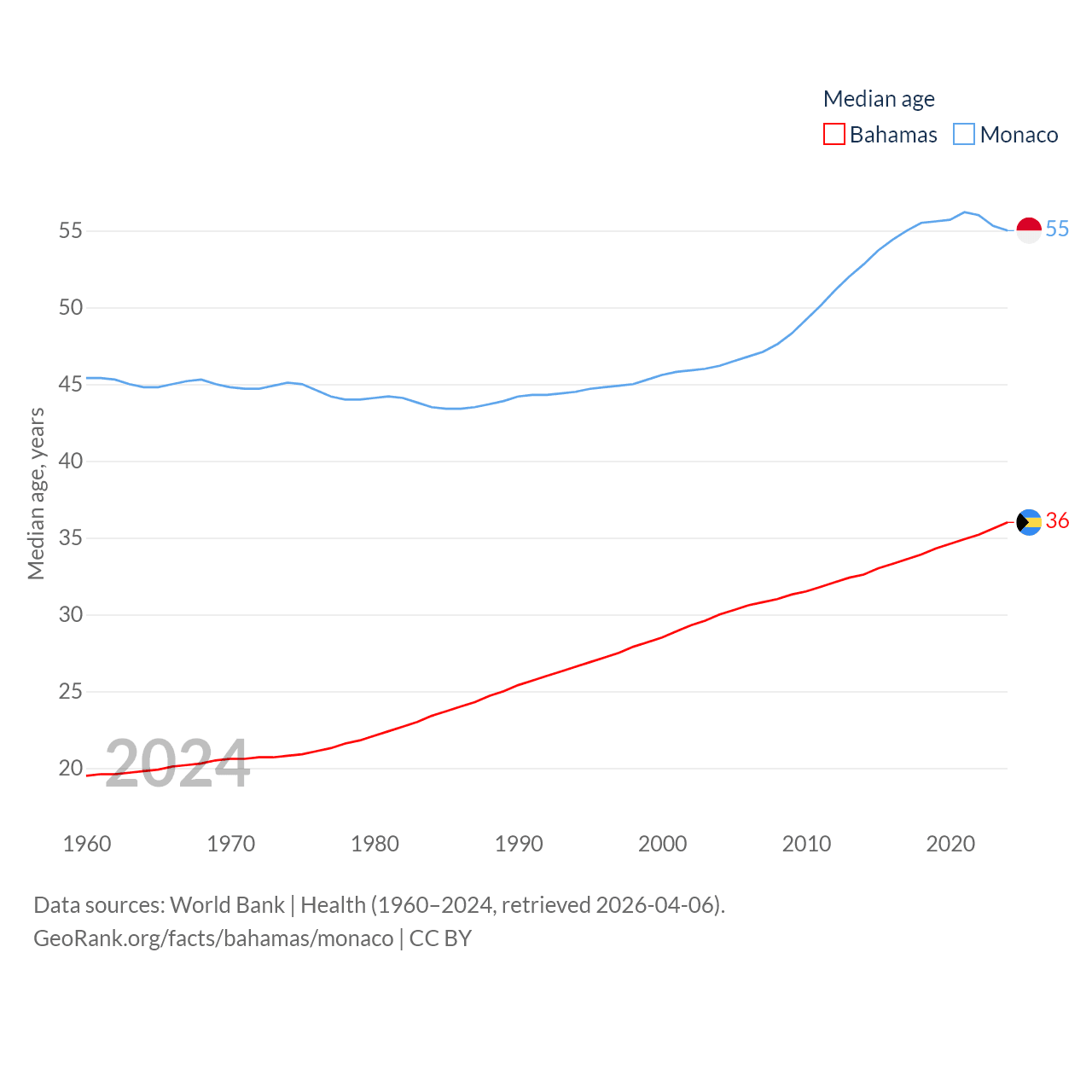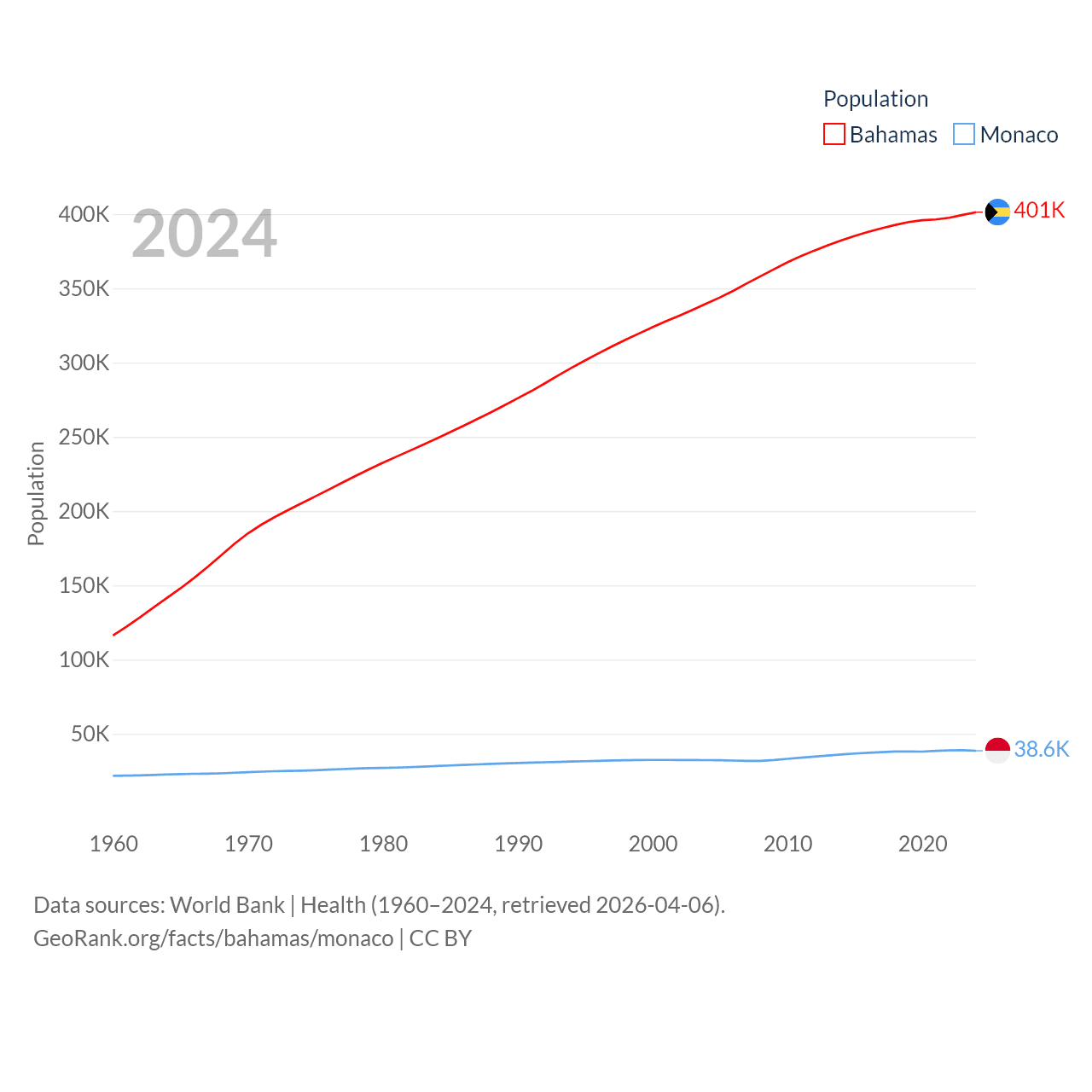 The Bahamas has a population of 401K (ranked 172/197), compared with 38.6K in Monaco (ranked 191/197). The Bahamas' land area is 3,865 sq mi versus 0.8 sq mi for Monaco (ranked 162nd vs. 196th).