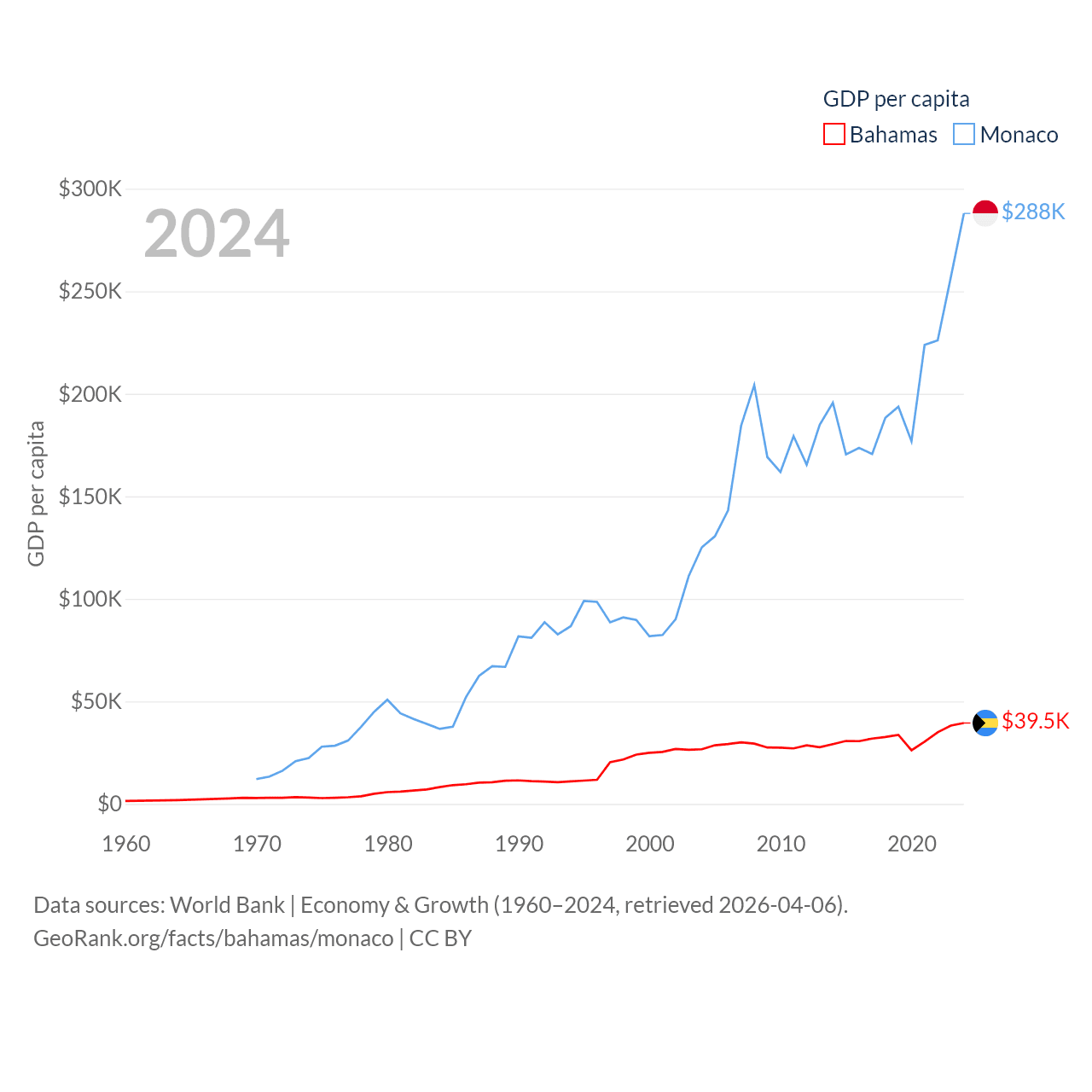 By GDP, The Bahamas ranks 140/197 ($15.8B) and Monaco ranks 152/197 ($11.1B). By GDP per capita, The Bahamas ranks 30/197 ($39,455), while Monaco ranks 1/197 ($288,001).