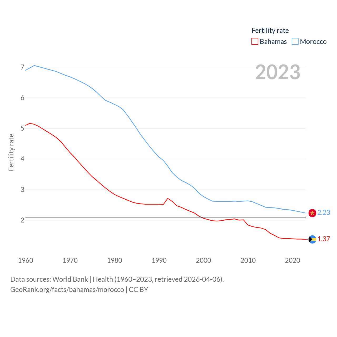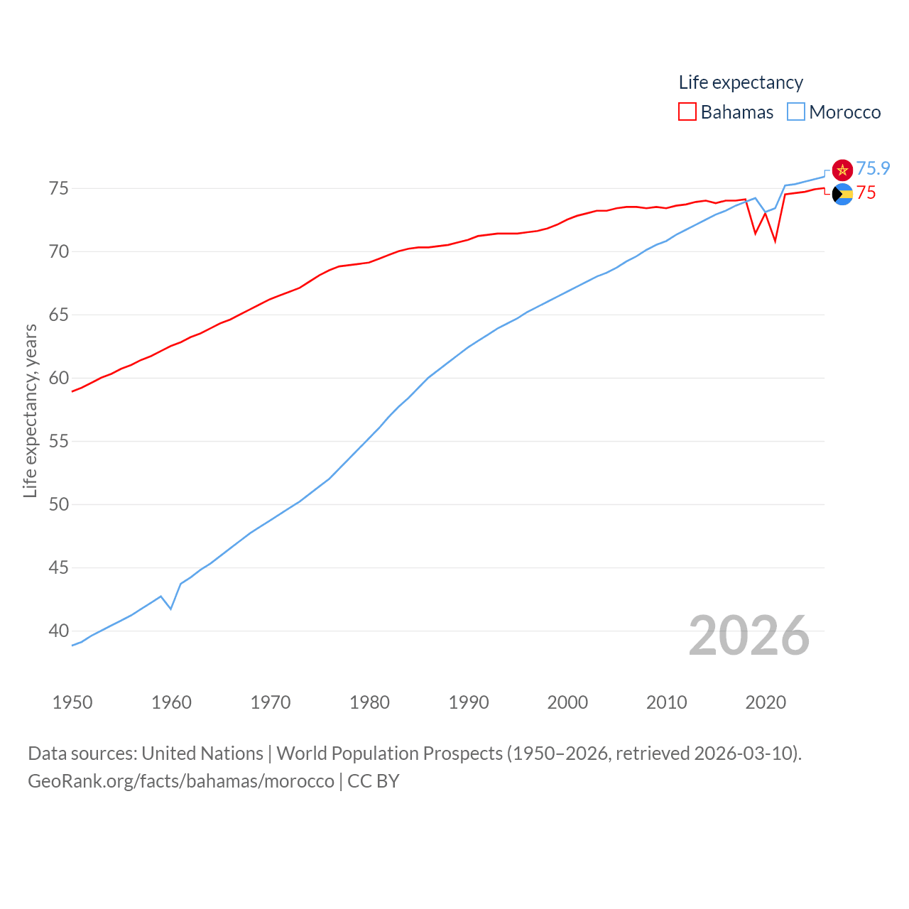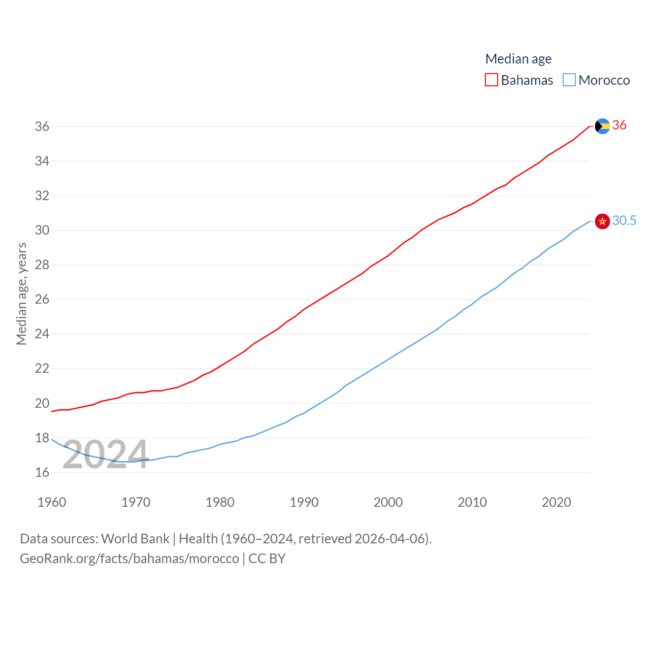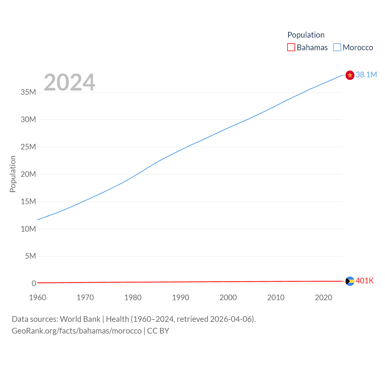 The Bahamas has a population of 401K (ranked 172/197), compared with 38.1M in Morocco (ranked 39/197). The Bahamas' land area is 3,865 sq mi versus 172,317 sq mi for Morocco (ranked 162nd vs. 55th).