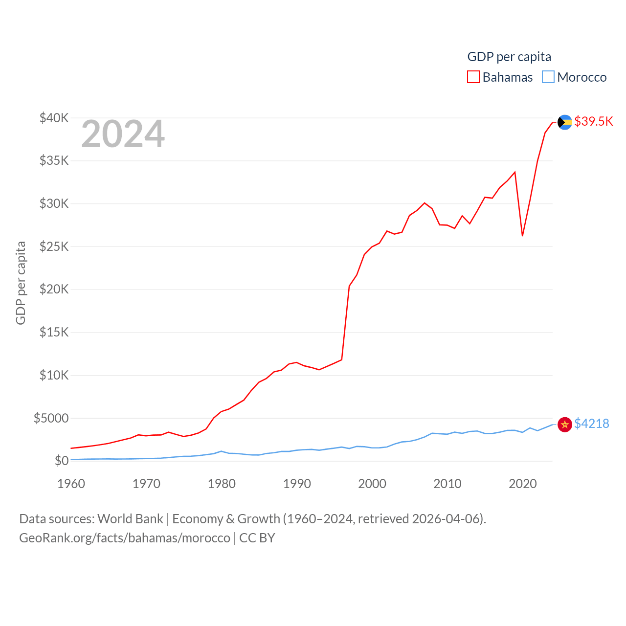 By GDP, The Bahamas ranks 140/197 ($15.8B) and Morocco ranks 58/197 ($161B). By GDP per capita, The Bahamas ranks 30/197 ($39,455), while Morocco ranks 127/197 ($4,218).