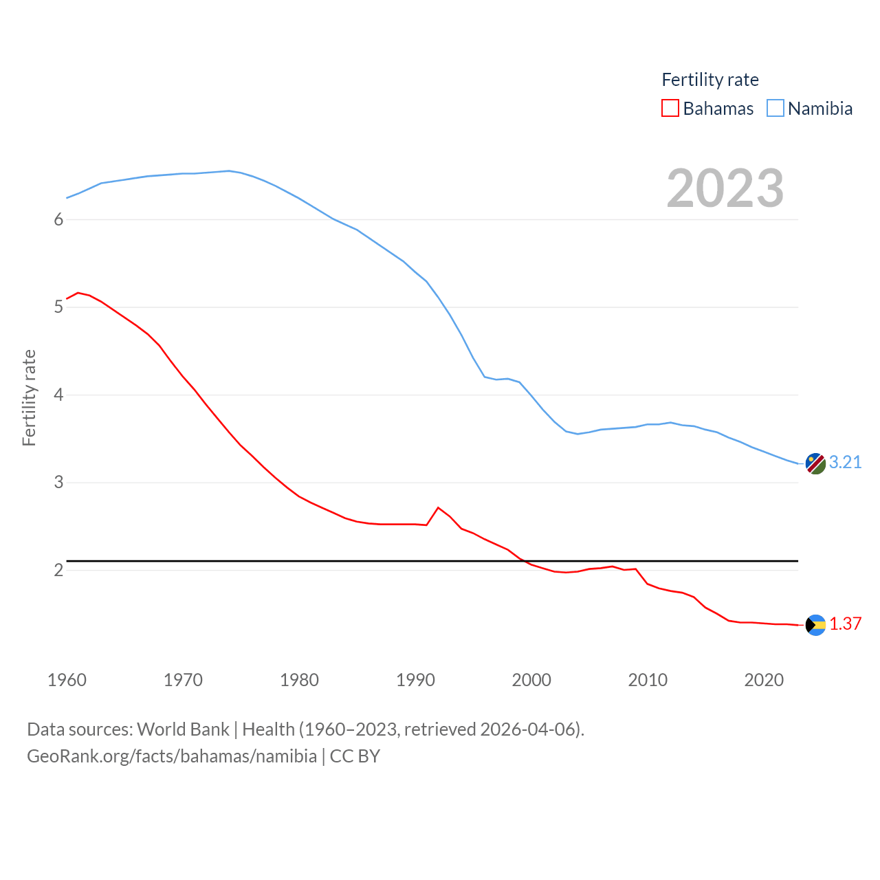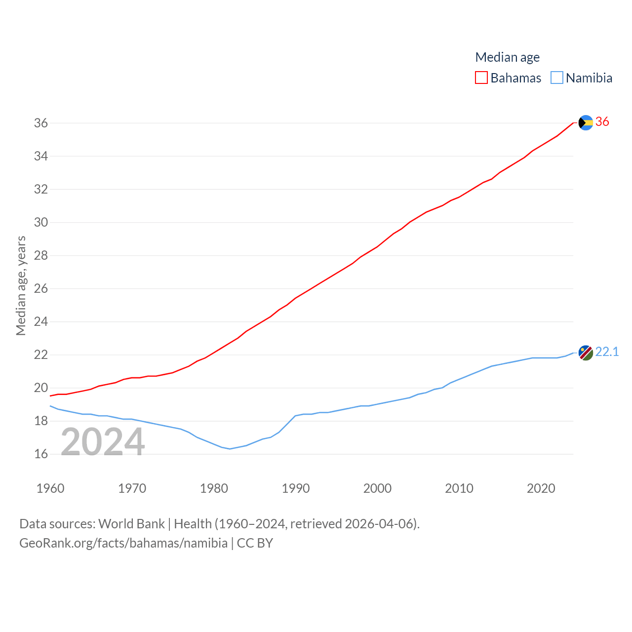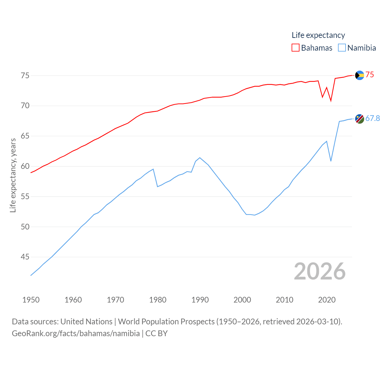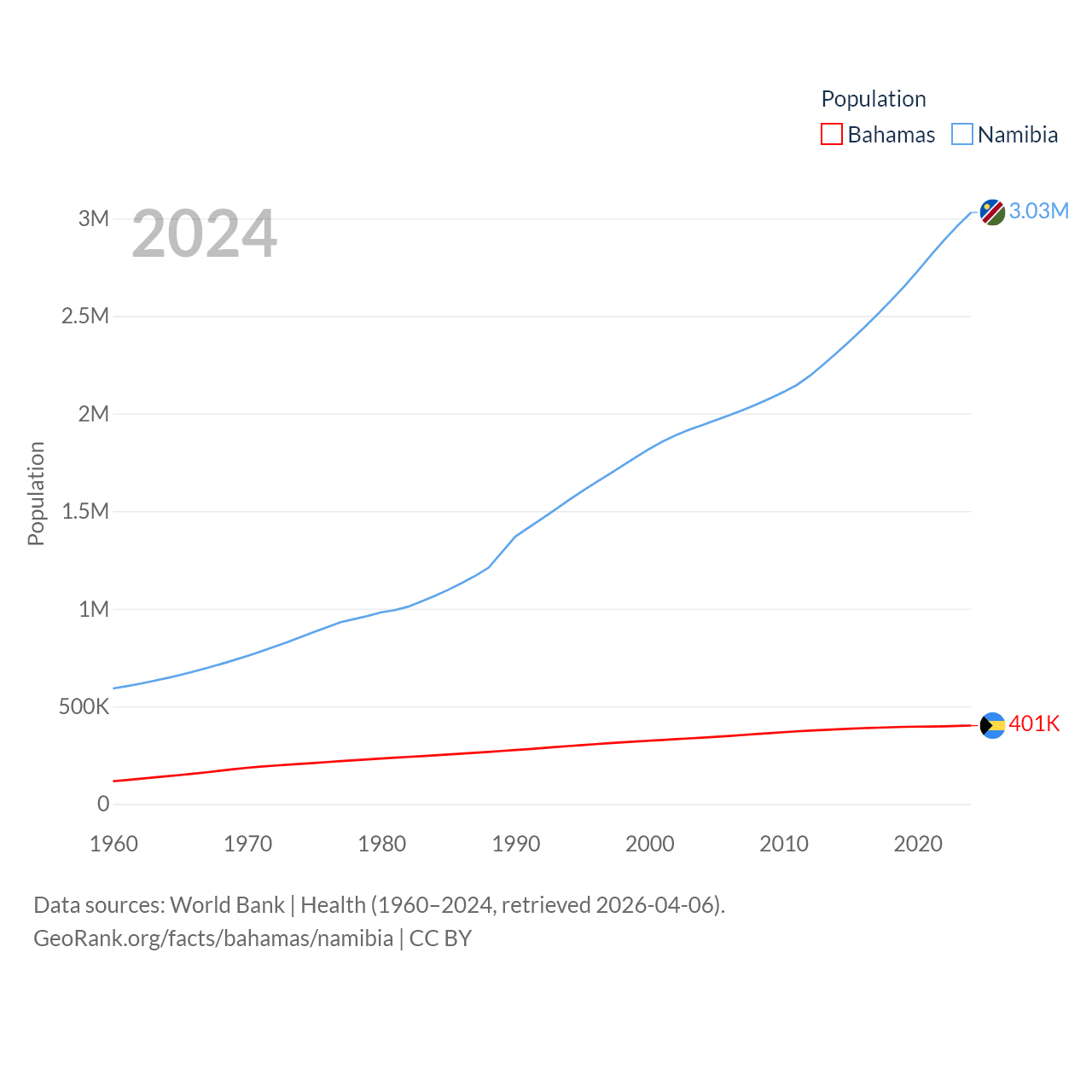 The Bahamas has a population of 401K (ranked 172/197), compared with 3.03M in Namibia (ranked 136/197). The Bahamas' land area is 3,865 sq mi versus 317,874 sq mi for Namibia (ranked 162nd vs. 33rd).
