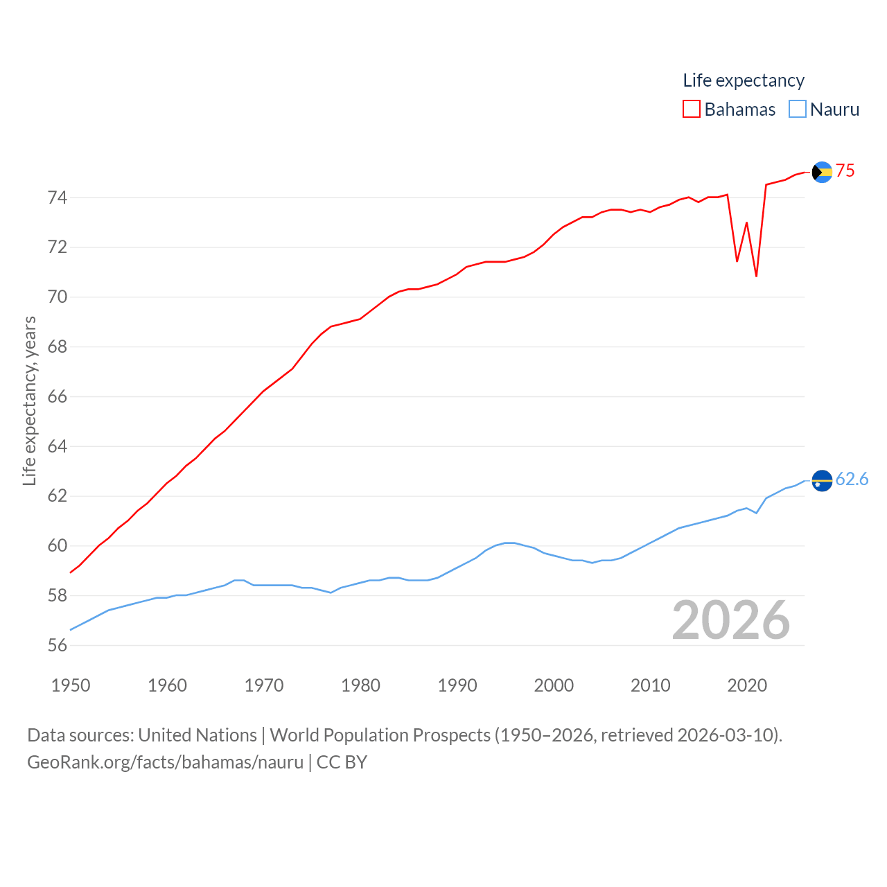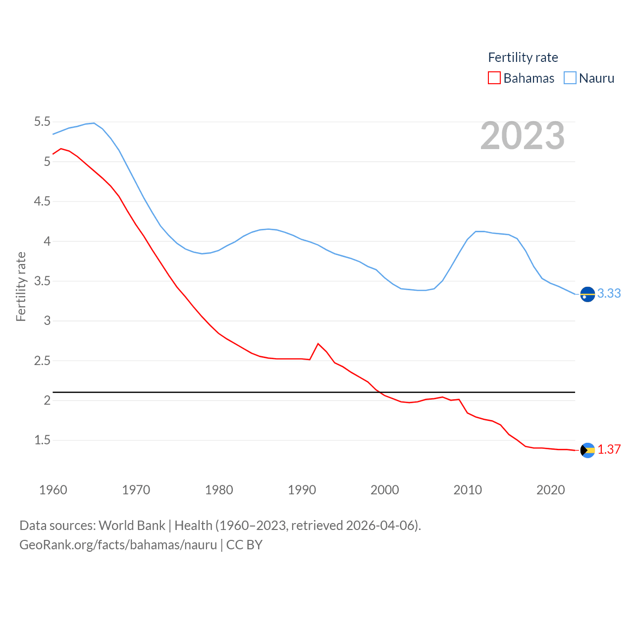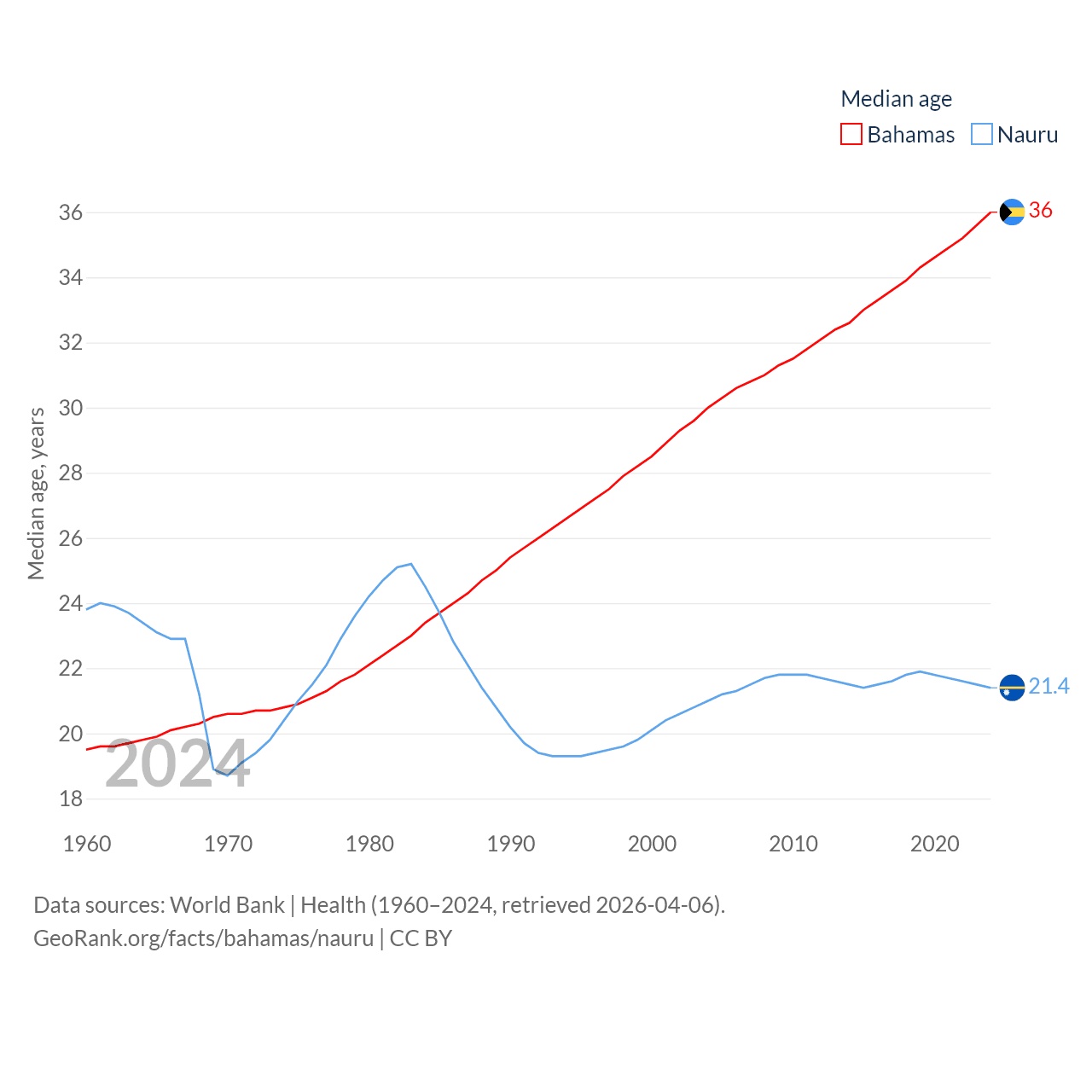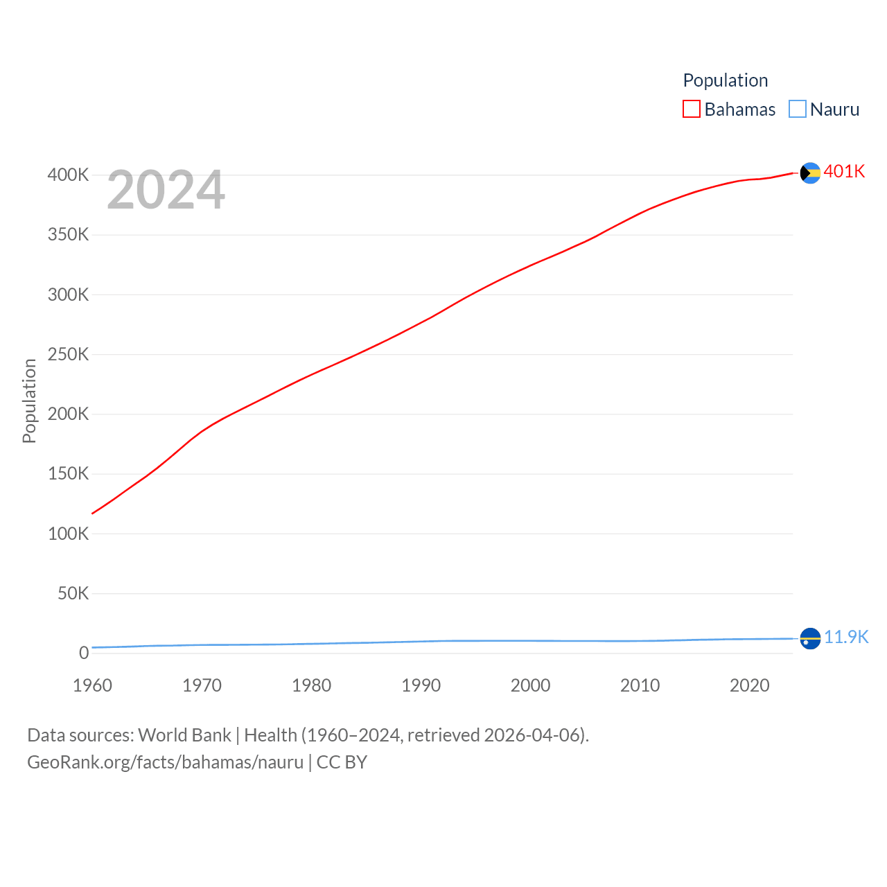 The Bahamas has a population of 401K (ranked 172/197), compared with 11.9K in Nauru (ranked 195/197). The Bahamas' land area is 3,865 sq mi versus 7.72 sq mi for Nauru (ranked 162nd vs. 195th).