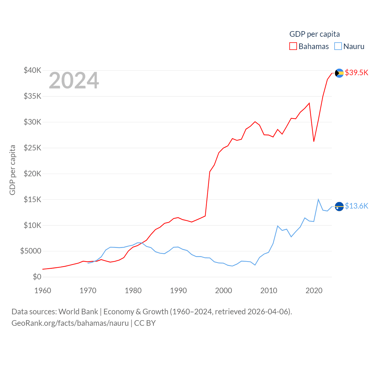 By GDP, The Bahamas ranks 140/197 ($15.8B) and Nauru ranks 195/197 ($163M). By GDP per capita, The Bahamas ranks 30/197 ($39,455), while Nauru ranks 74/197 ($13,609).