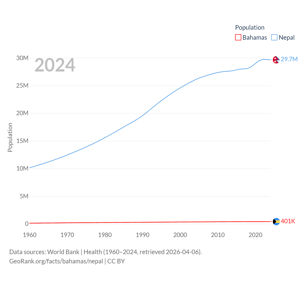 The Bahamas has a population of 401K (ranked 172/197), compared with 29.7M in Nepal (ranked 51/197). The Bahamas' land area is 3,865 sq mi versus 55,348 sq mi for Nepal (ranked 162nd vs. 92nd).