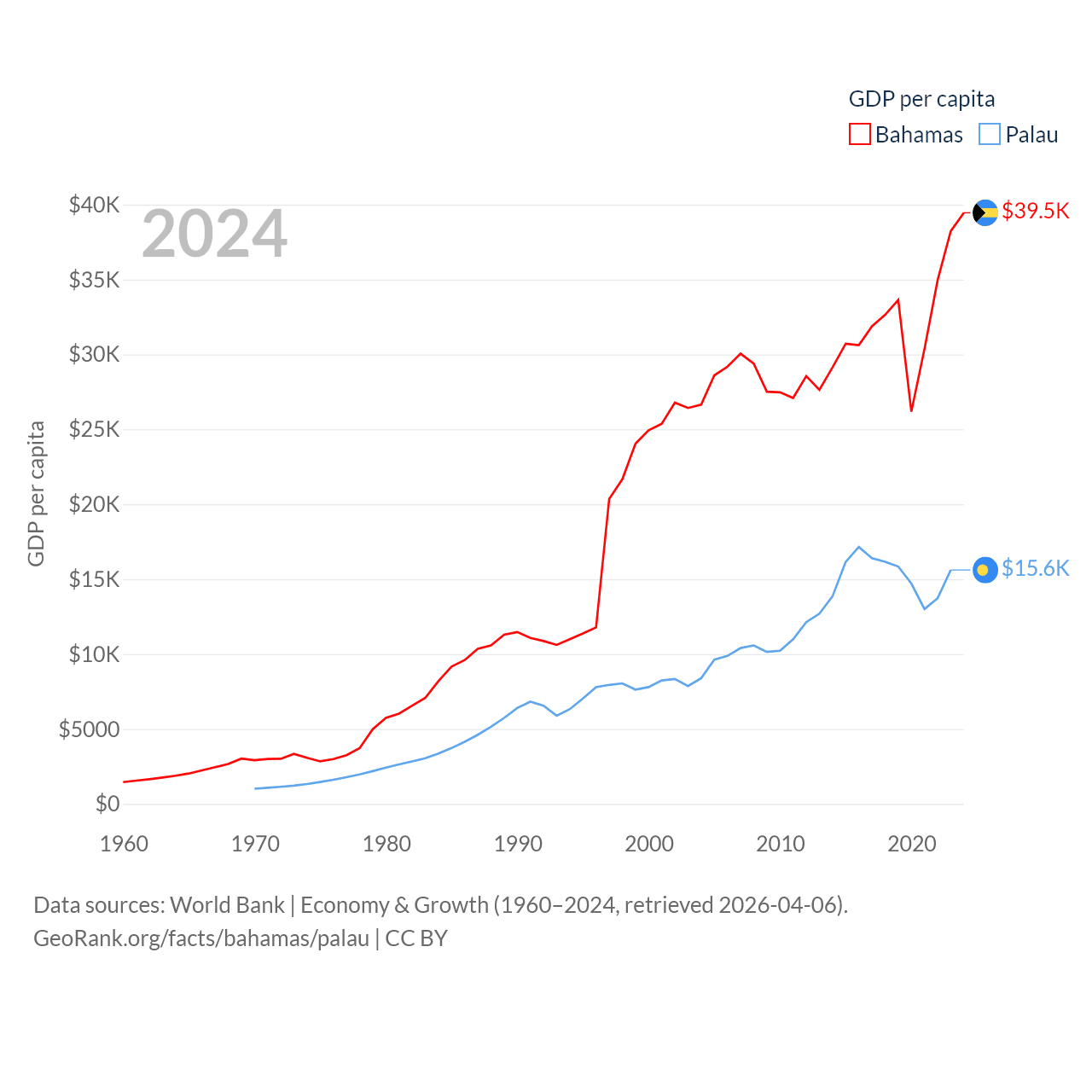 By GDP, The Bahamas ranks 140/197 ($15.8B) and Palau ranks 194/197 ($277M). By GDP per capita, The Bahamas ranks 30/197 ($39,455), while Palau ranks 67/197 ($15,611).