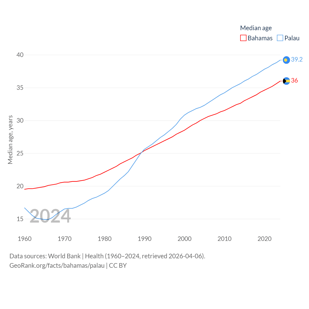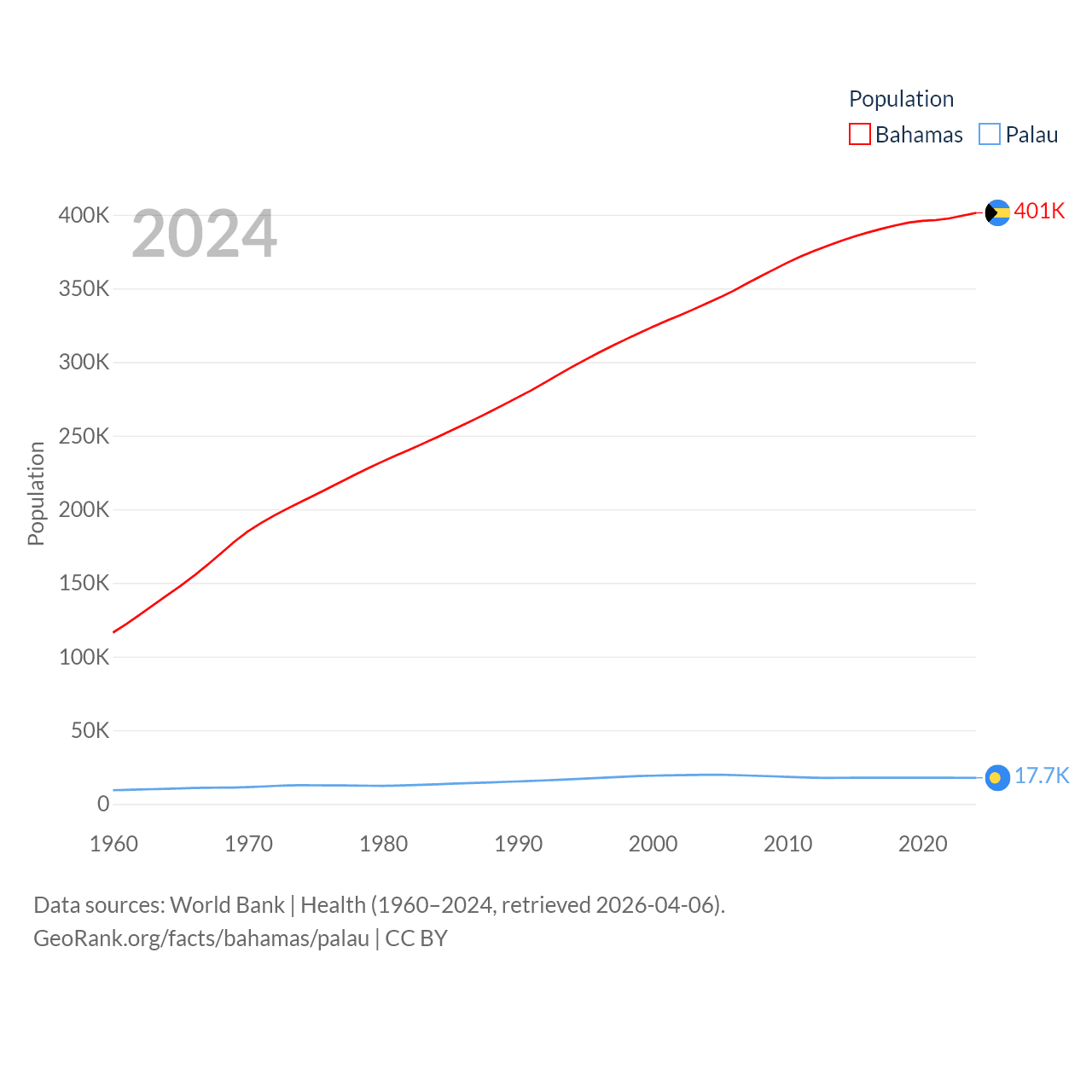 The Bahamas has a population of 401K (ranked 172/197), compared with 17.7K in Palau (ranked 194/197). The Bahamas' land area is 3,865 sq mi versus 177.6 sq mi for Palau (ranked 162nd vs. 180th).