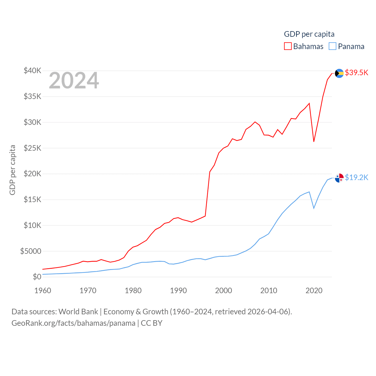 By GDP, The Bahamas ranks 140/197 ($15.8B) and Panama ranks 78/197 ($86.5B). By GDP per capita, The Bahamas ranks 30/197 ($39,455), while Panama ranks 60/197 ($19,161).