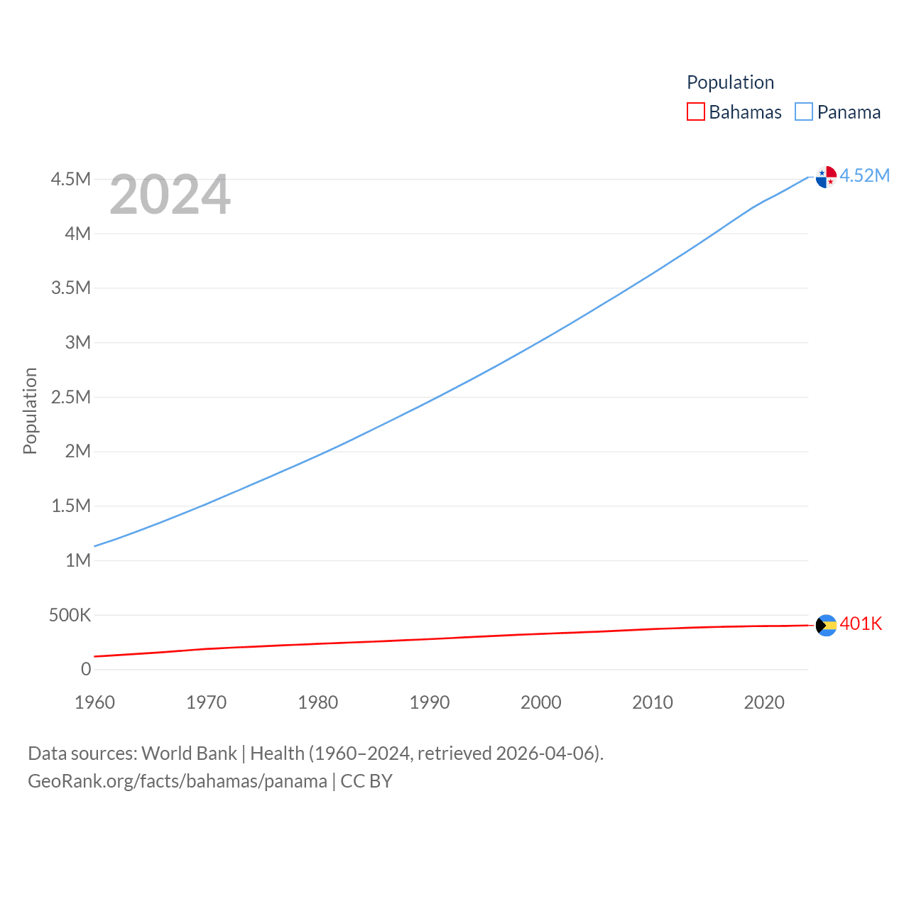 The Bahamas has a population of 401K (ranked 172/197), compared with 4.52M in Panama (ranked 128/197). The Bahamas' land area is 3,865 sq mi versus 28,641 sq mi for Panama (ranked 162nd vs. 115th).