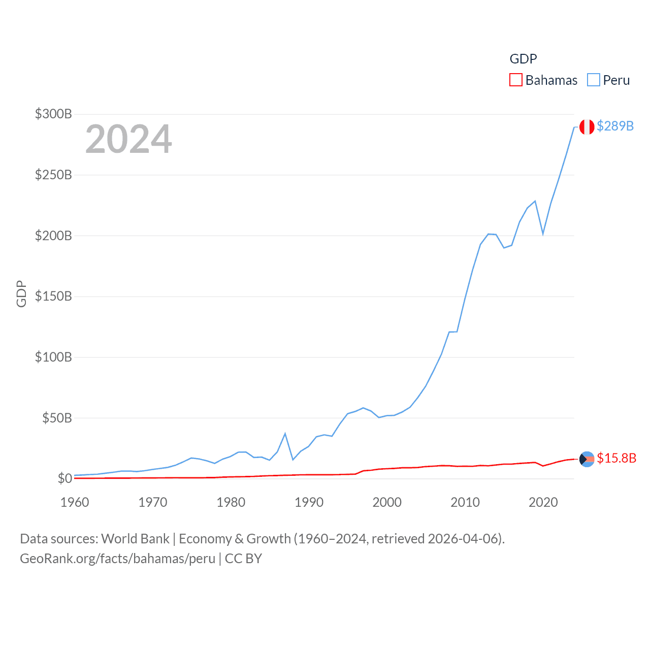 By GDP, The Bahamas ranks 140/197 ($15.8B) and Peru ranks 49/197 ($289B). By GDP per capita, The Bahamas ranks 30/197 ($39,455), while Peru ranks 91/197 ($8,452).