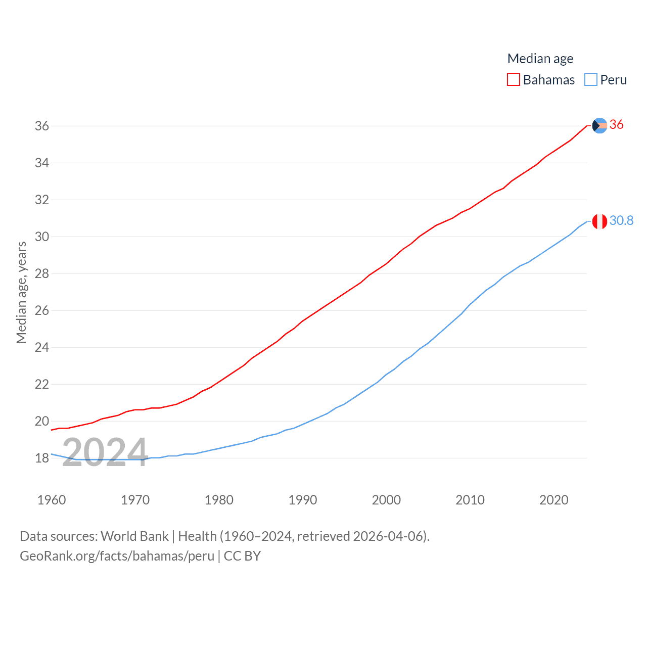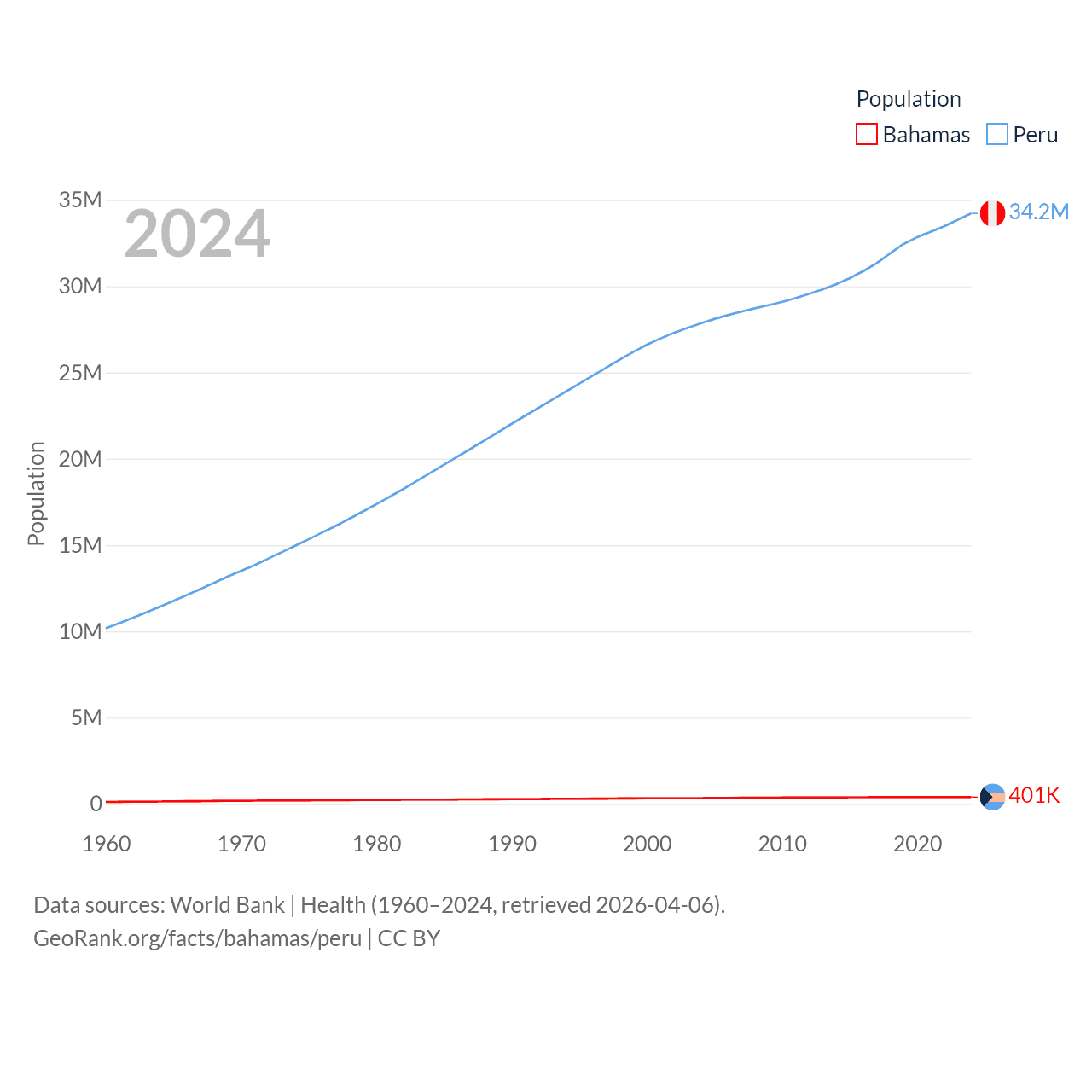 The Bahamas has a population of 401K (ranked 172/197), compared with 34.2M in Peru (ranked 48/197). The Bahamas' land area is 3,865 sq mi versus 494,211 sq mi for Peru (ranked 162nd vs. 19th).