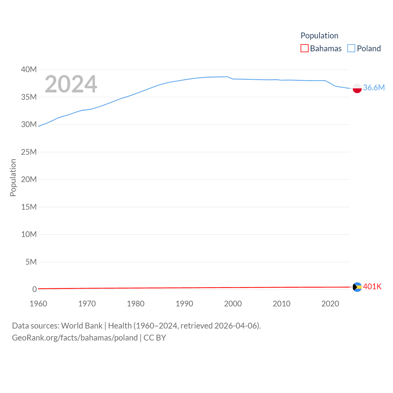 The Bahamas has a population of 401K (ranked 172/197), compared with 36.6M in Poland (ranked 42/197). The Bahamas' land area is 3,865 sq mi versus 118,252 sq mi for Poland (ranked 162nd vs. 69th).