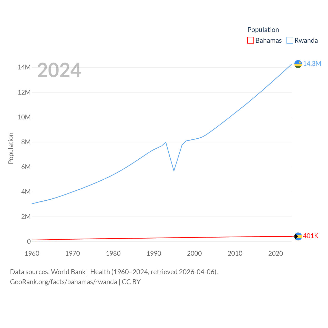 The Bahamas has a population of 401K (ranked 172/197), compared with 14.3M in Rwanda (ranked 77/197). The Bahamas' land area is 3,865 sq mi versus 9,525 sq mi for Rwanda (ranked 162nd vs. 146th).
