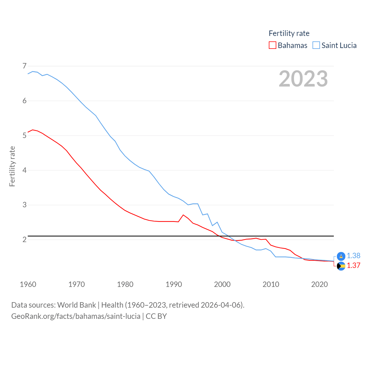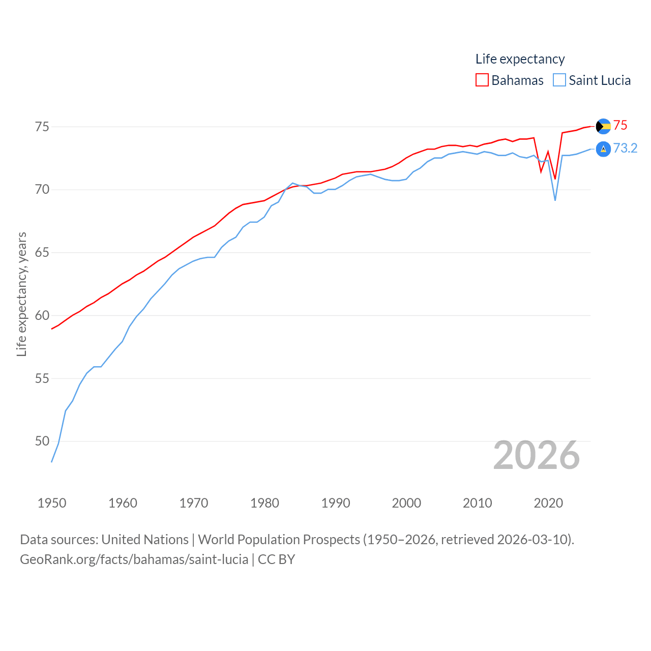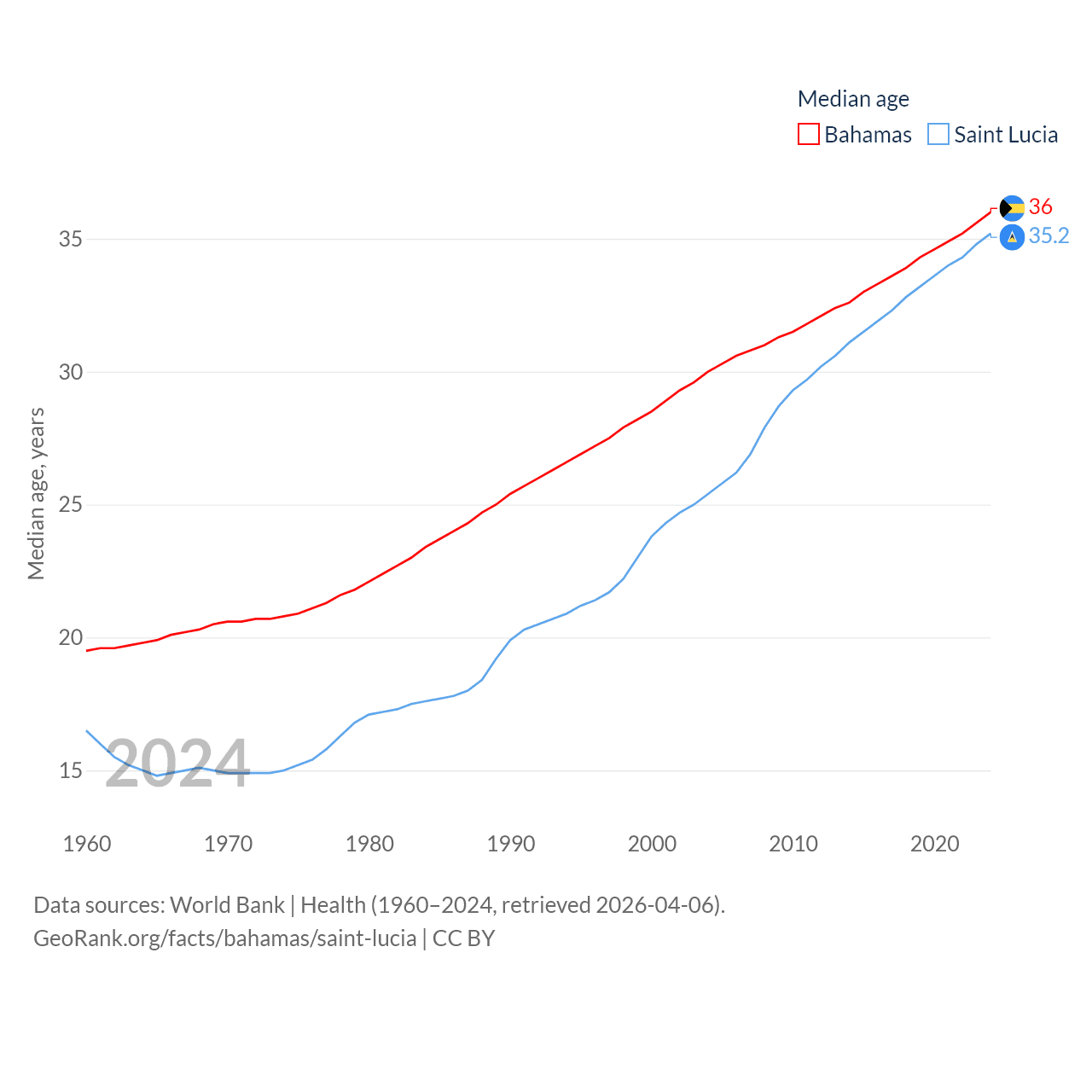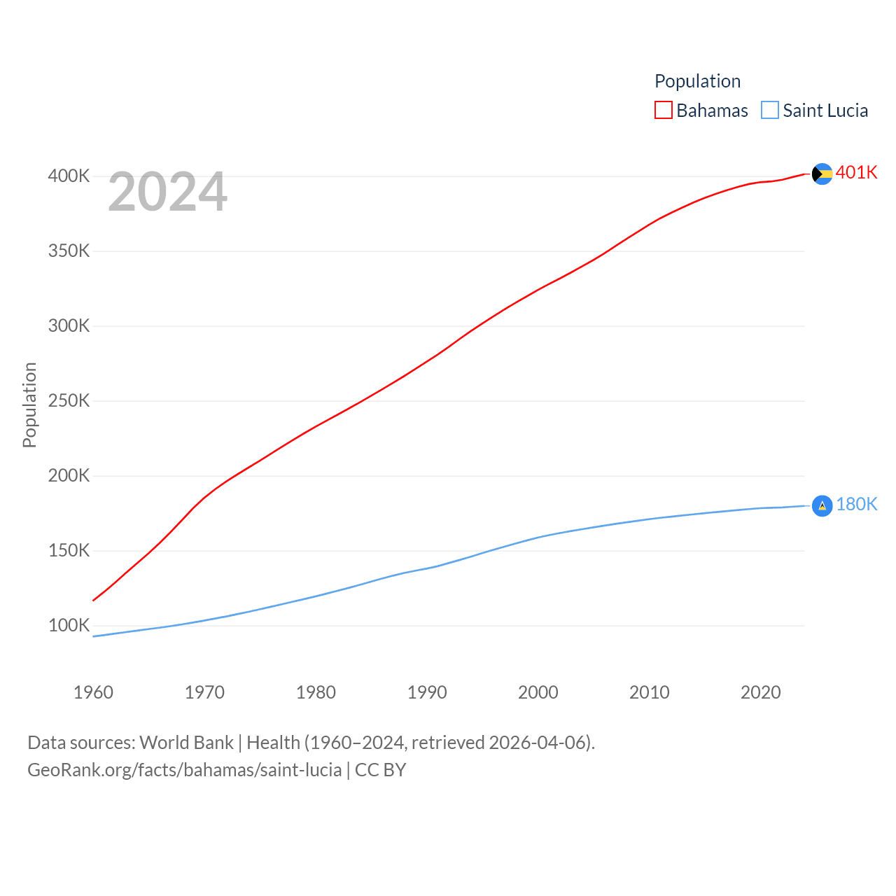 The Bahamas has a population of 401K (ranked 172/197), compared with 180K in Saint Lucia (ranked 178/197). The Bahamas' land area is 3,865 sq mi versus 235.5 sq mi for Saint Lucia (ranked 162nd vs. 178th).