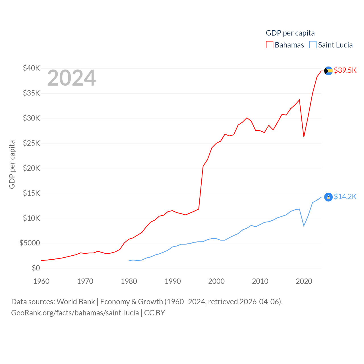 By GDP, The Bahamas ranks 140/197 ($15.8B) and Saint Lucia ranks 173/197 ($2.55B). By GDP per capita, The Bahamas ranks 30/197 ($39,455), while Saint Lucia ranks 70/197 ($14,182).