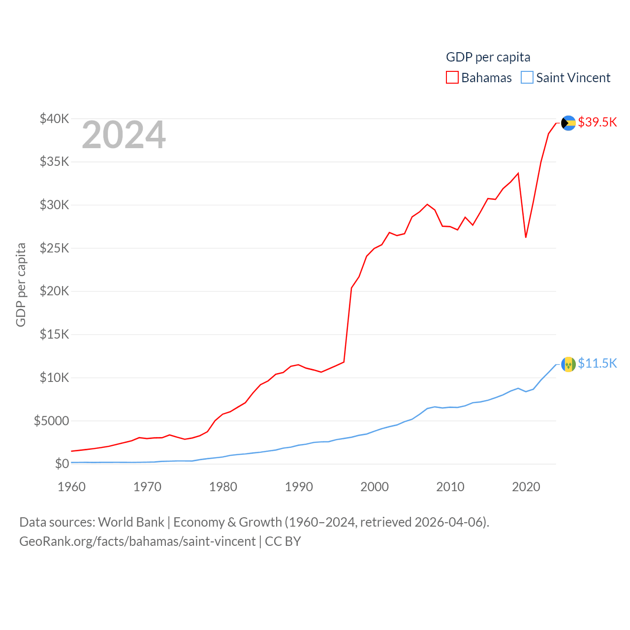 By GDP, The Bahamas ranks 140/197 ($15.8B) and Saint Vincent ranks 186/197 ($1.16B). By GDP per capita, The Bahamas ranks 30/197 ($39,455), while Saint Vincent ranks 81/197 ($11,501).