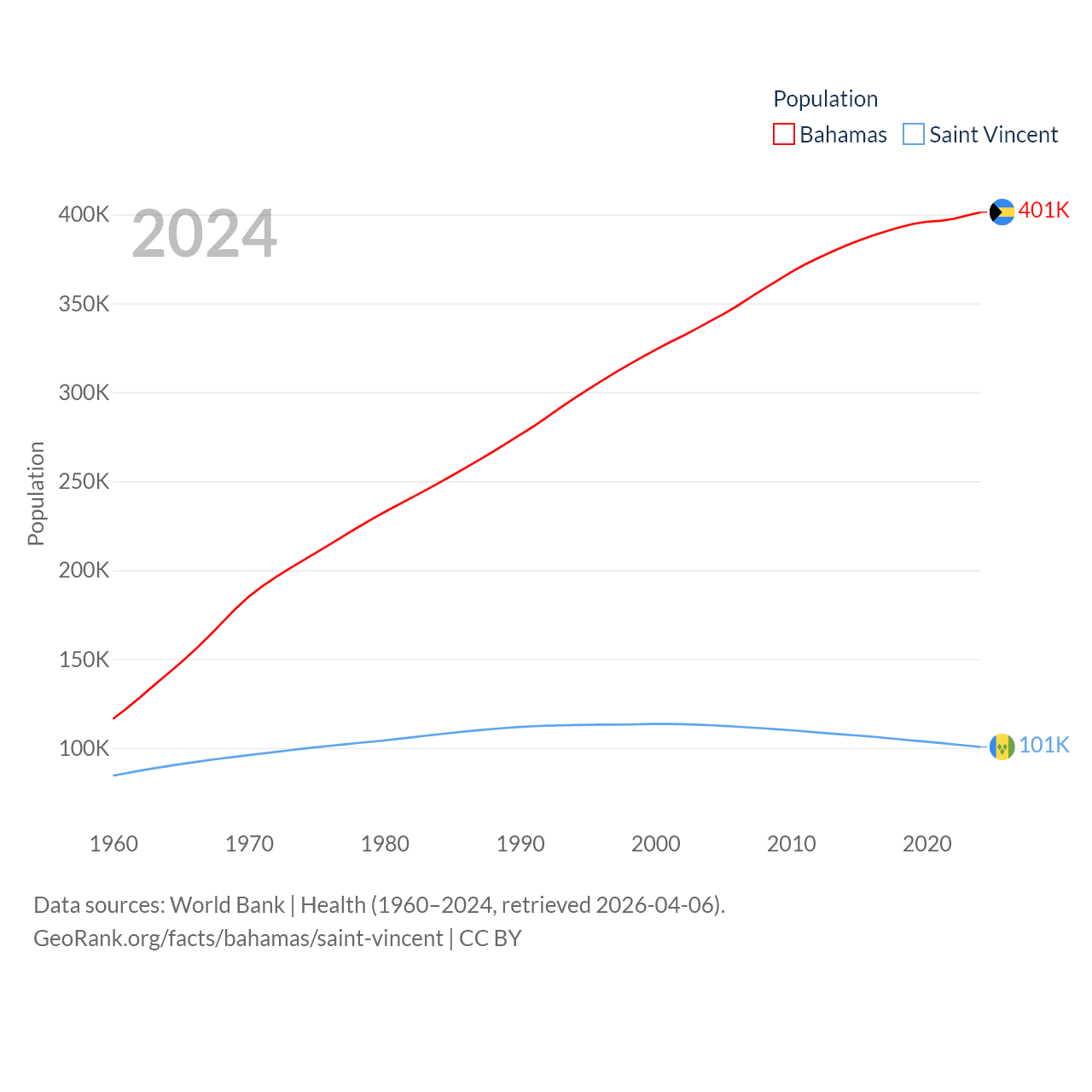 The Bahamas has a population of 401K (ranked 172/197), compared with 101K in Saint Vincent (ranked 184/197). The Bahamas' land area is 3,865 sq mi versus 150.6 sq mi for Saint Vincent (ranked 162nd vs. 185th).