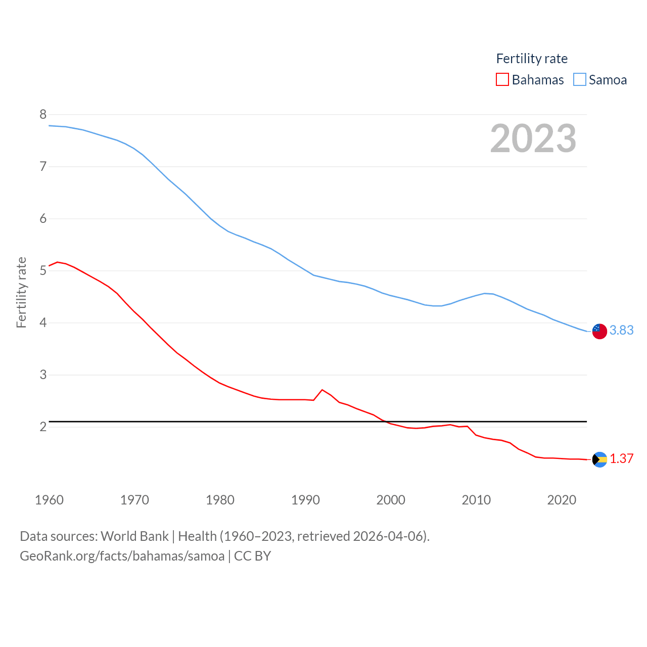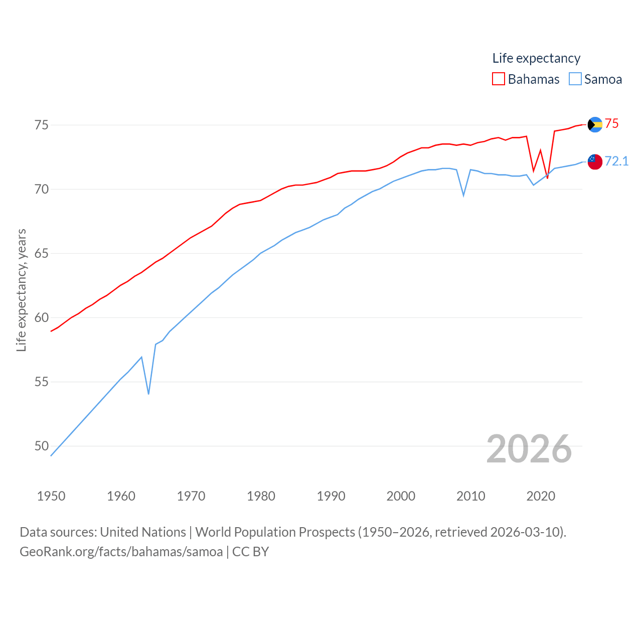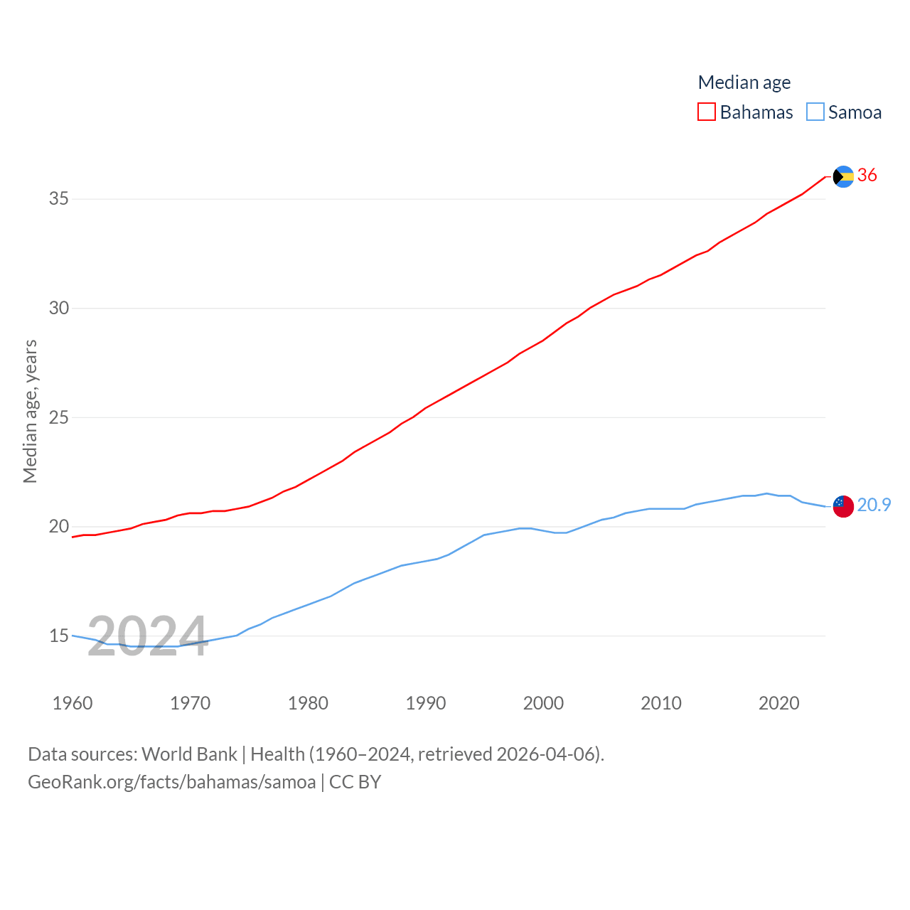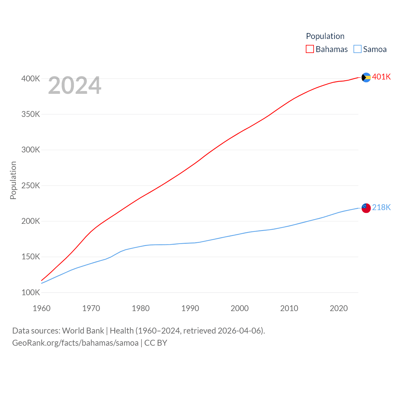 The Bahamas has a population of 401K (ranked 172/197), compared with 218K in Samoa (ranked 177/197). The Bahamas' land area is 3,865 sq mi versus 1,073 sq mi for Samoa (ranked 162nd vs. 168th).