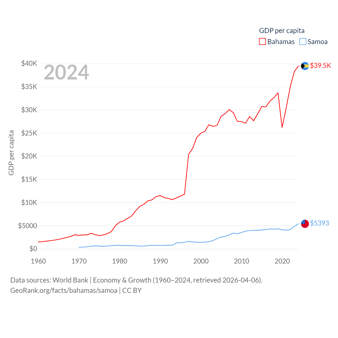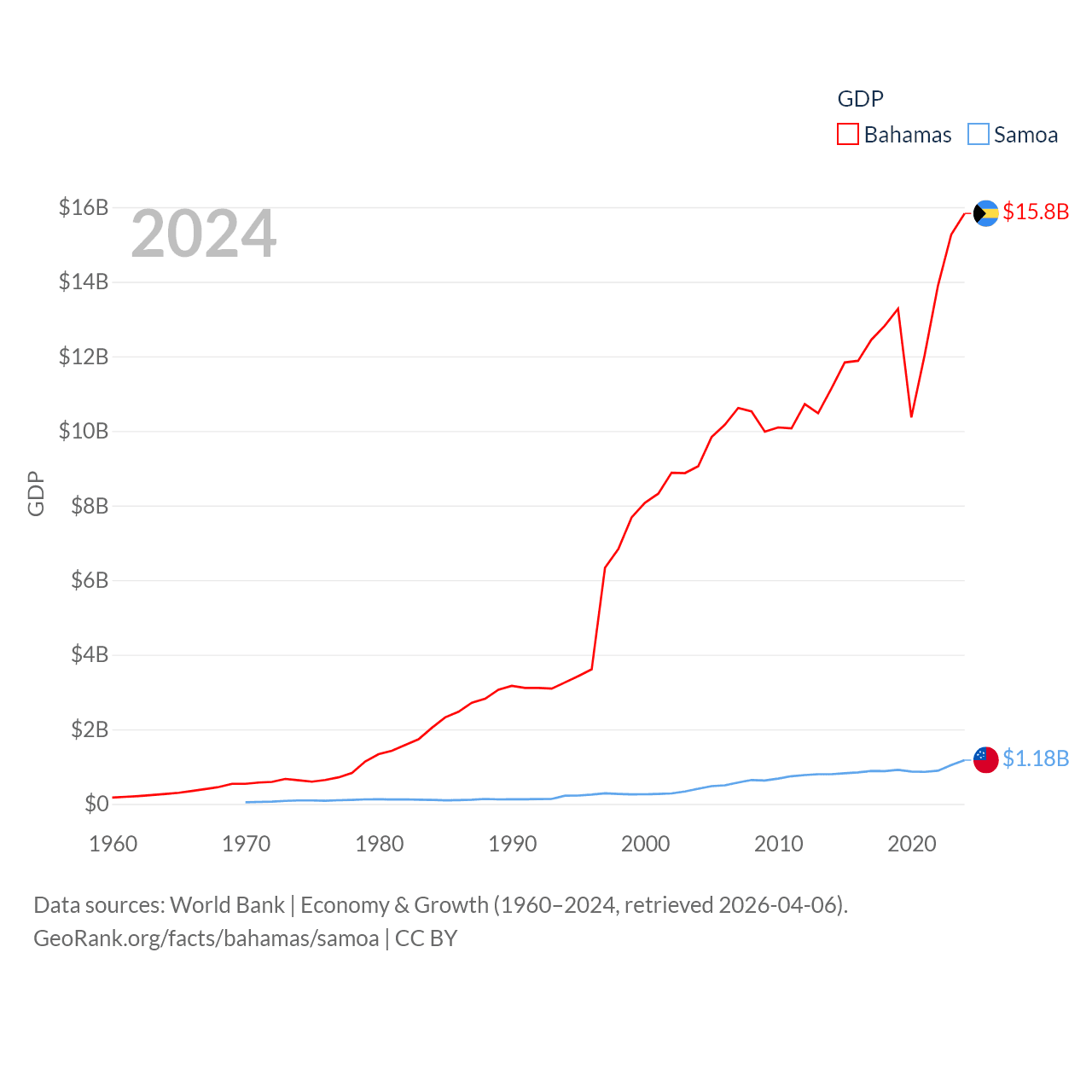 By GDP, The Bahamas ranks 140/197 ($15.8B) and Samoa ranks 185/197 ($1.18B). By GDP per capita, The Bahamas ranks 30/197 ($39,455), while Samoa ranks 117/197 ($5,393).