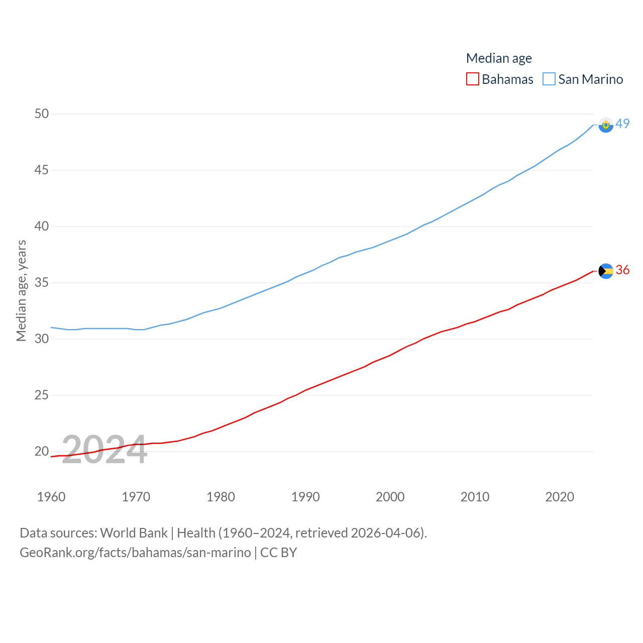 The Bahamas has a population of 401K (ranked 172/197), compared with 34K in San Marino (ranked 193/197). The Bahamas' land area is 3,865 sq mi versus 23.2 sq mi for San Marino (ranked 162nd vs. 193rd).