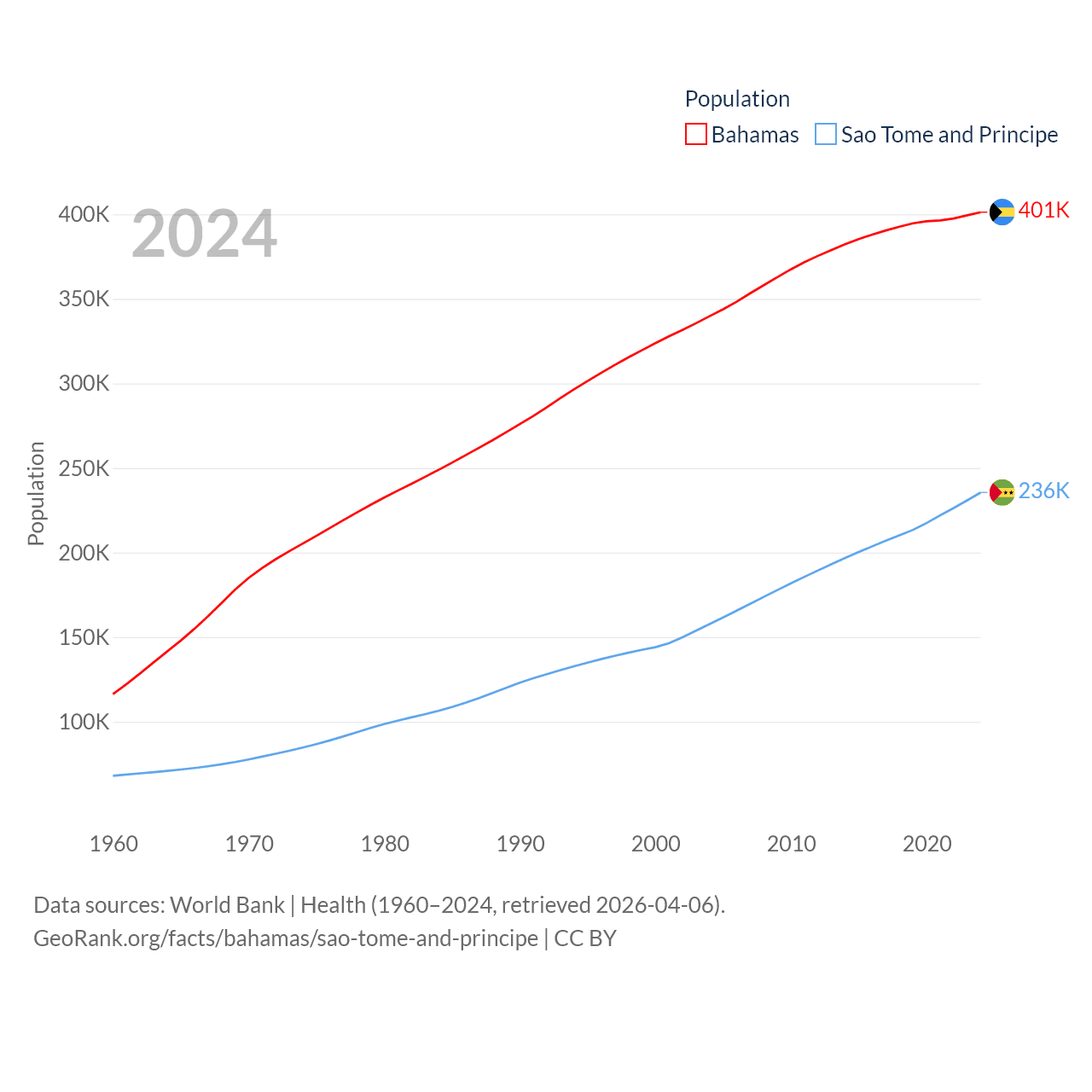 The Bahamas has a population of 401K (ranked 172/197), compared with 236K in Sao Tome and Principe (ranked 176/197). The Bahamas' land area is 3,865 sq mi versus 371 sq mi for Sao Tome and Principe (ranked 162nd vs. 172nd).
