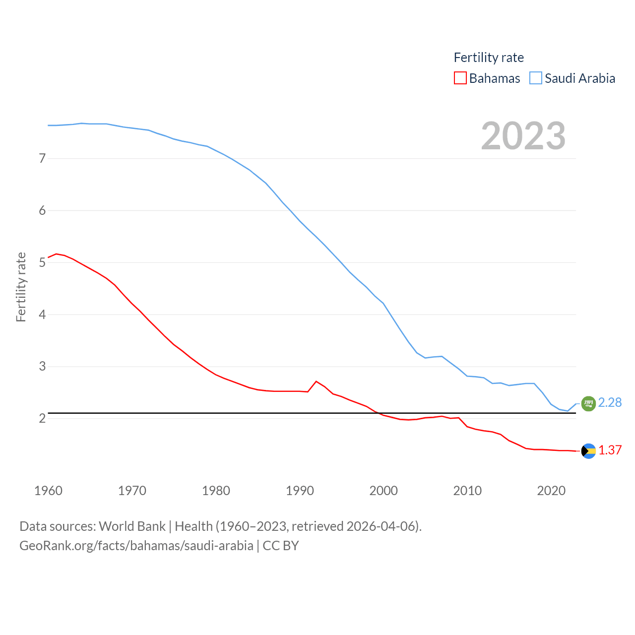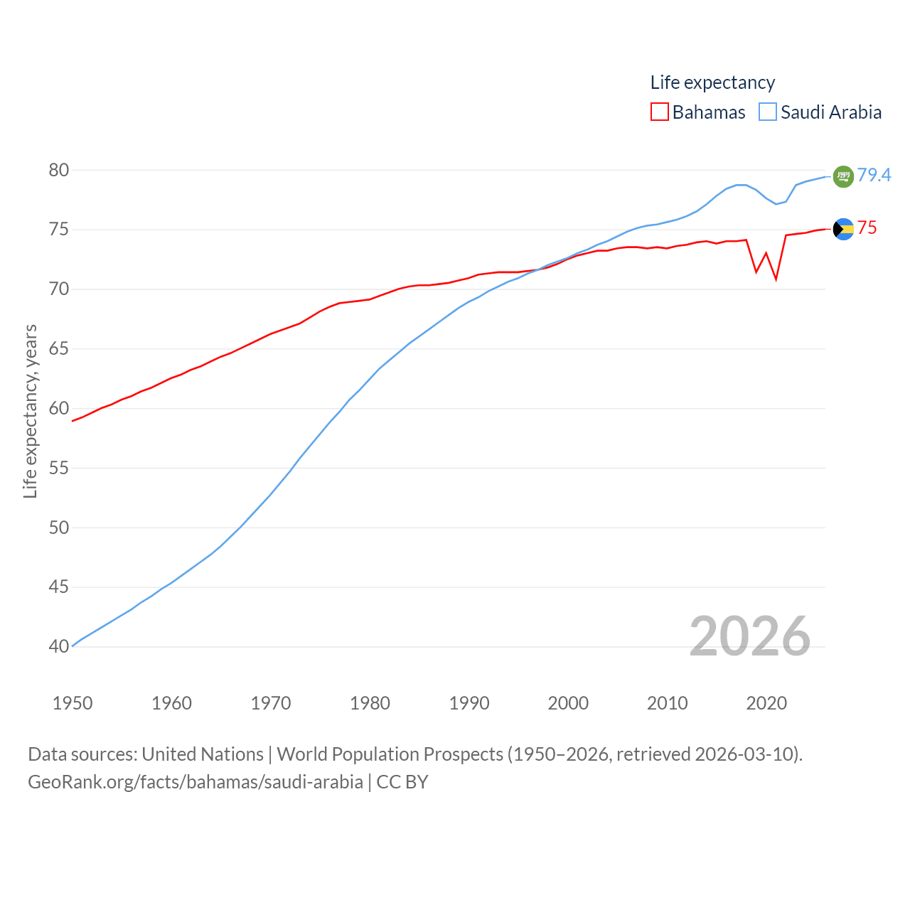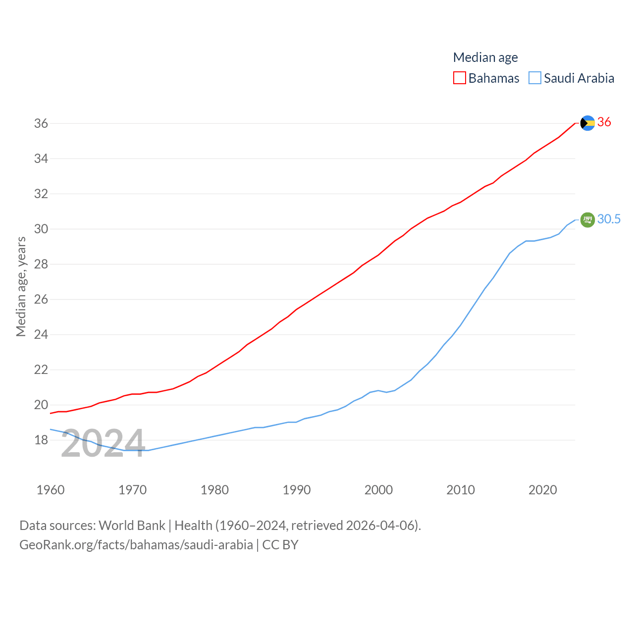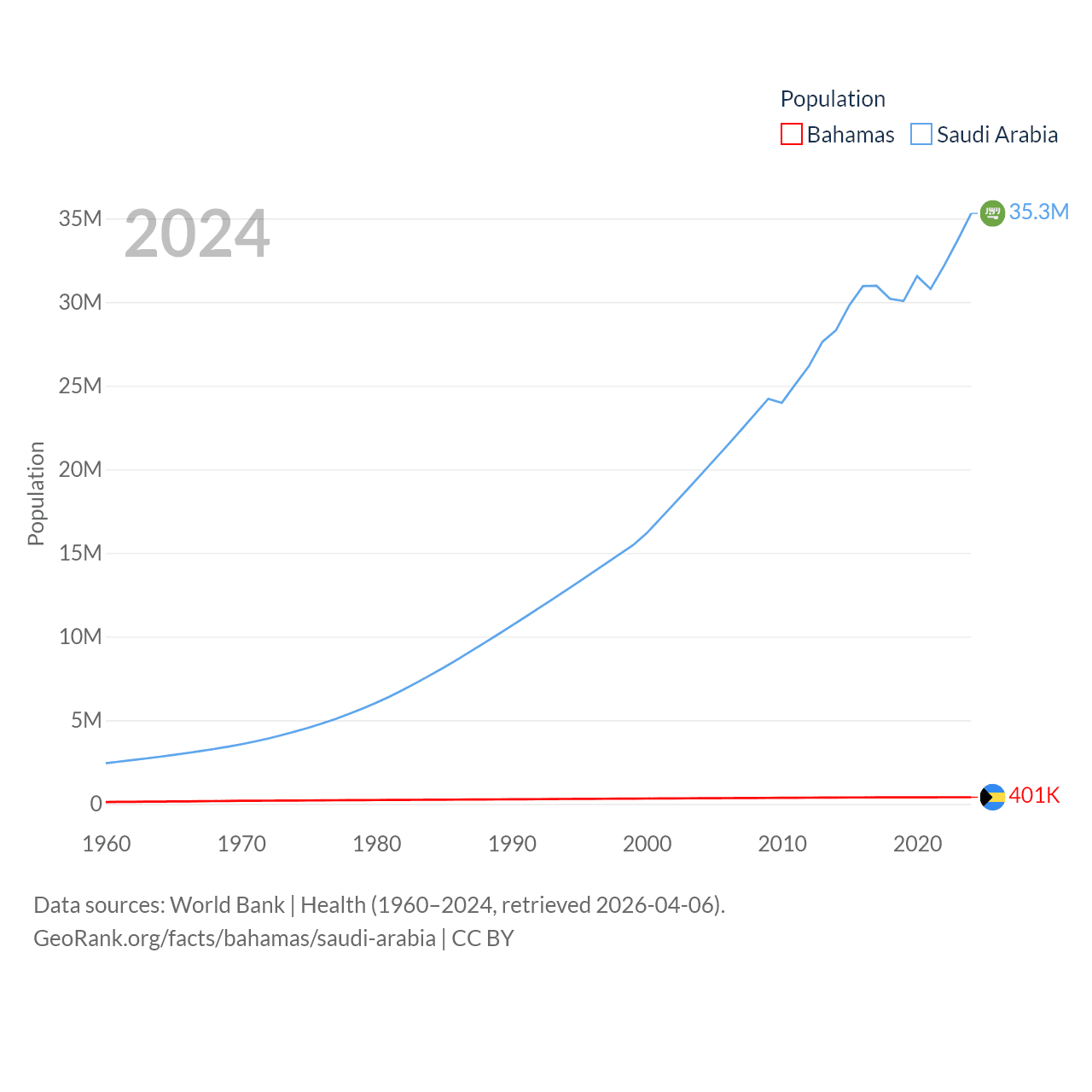 The Bahamas has a population of 401K (ranked 172/197), compared with 35.3M in Saudi Arabia (ranked 45/197). The Bahamas' land area is 3,865 sq mi versus 830,000 sq mi for Saudi Arabia (ranked 162nd vs. 12th).
