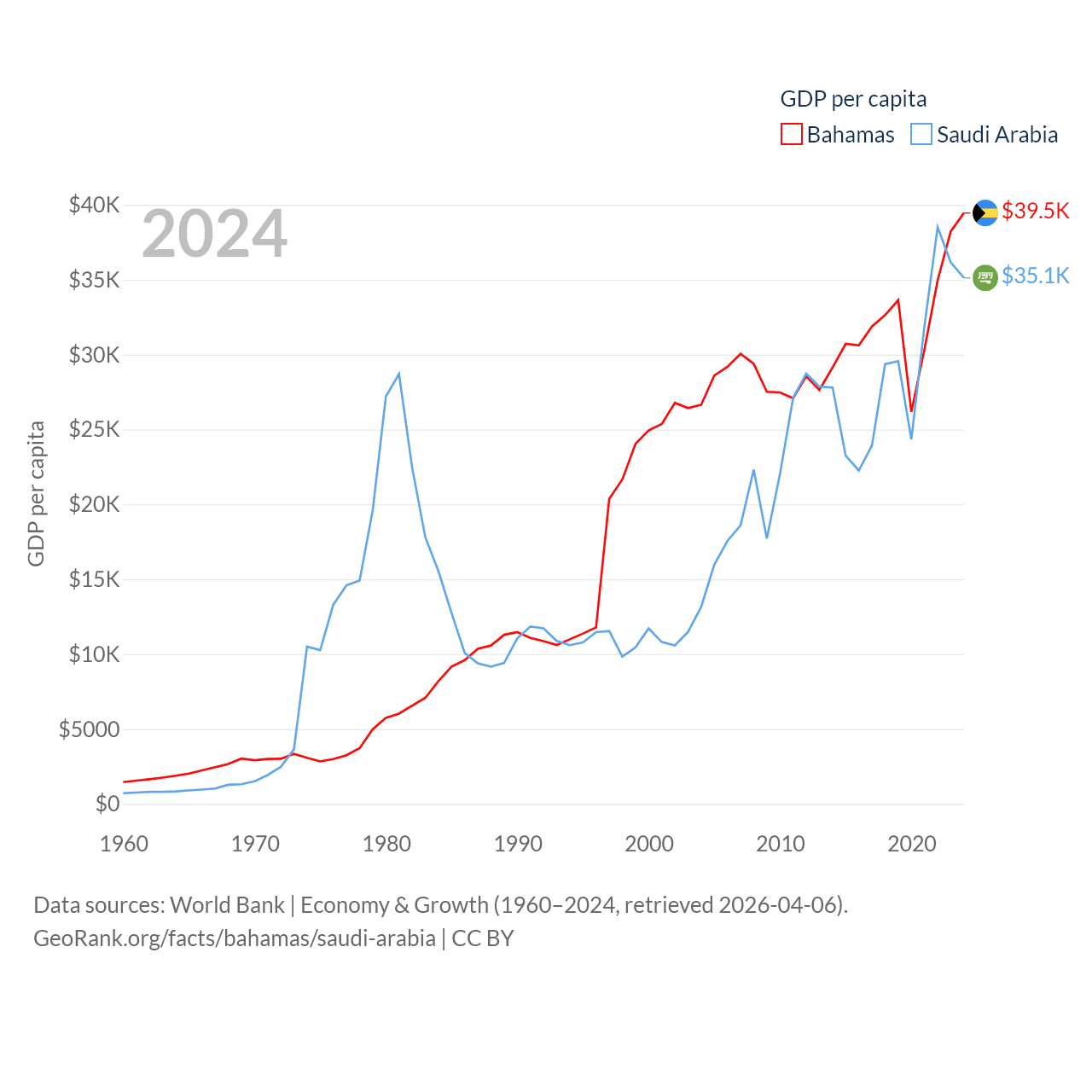 By GDP, The Bahamas ranks 140/197 ($15.8B) and Saudi Arabia ranks 18/197 ($1.24T). By GDP per capita, The Bahamas ranks 30/197 ($39,455), while Saudi Arabia ranks 33/197 ($35,122).