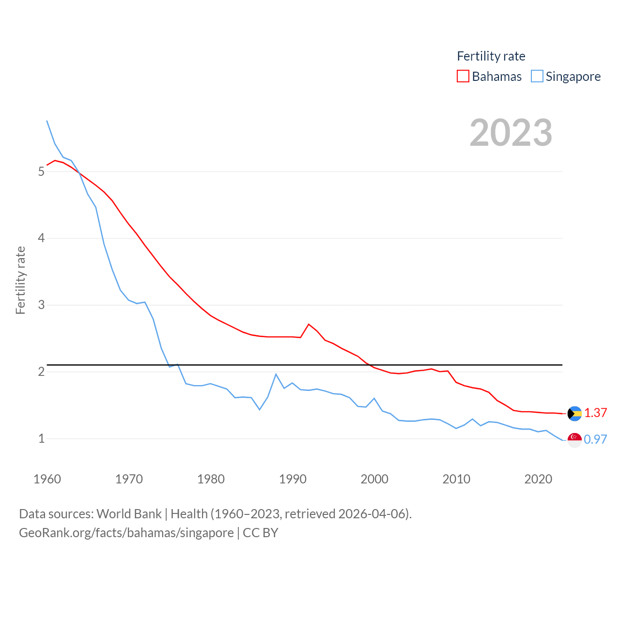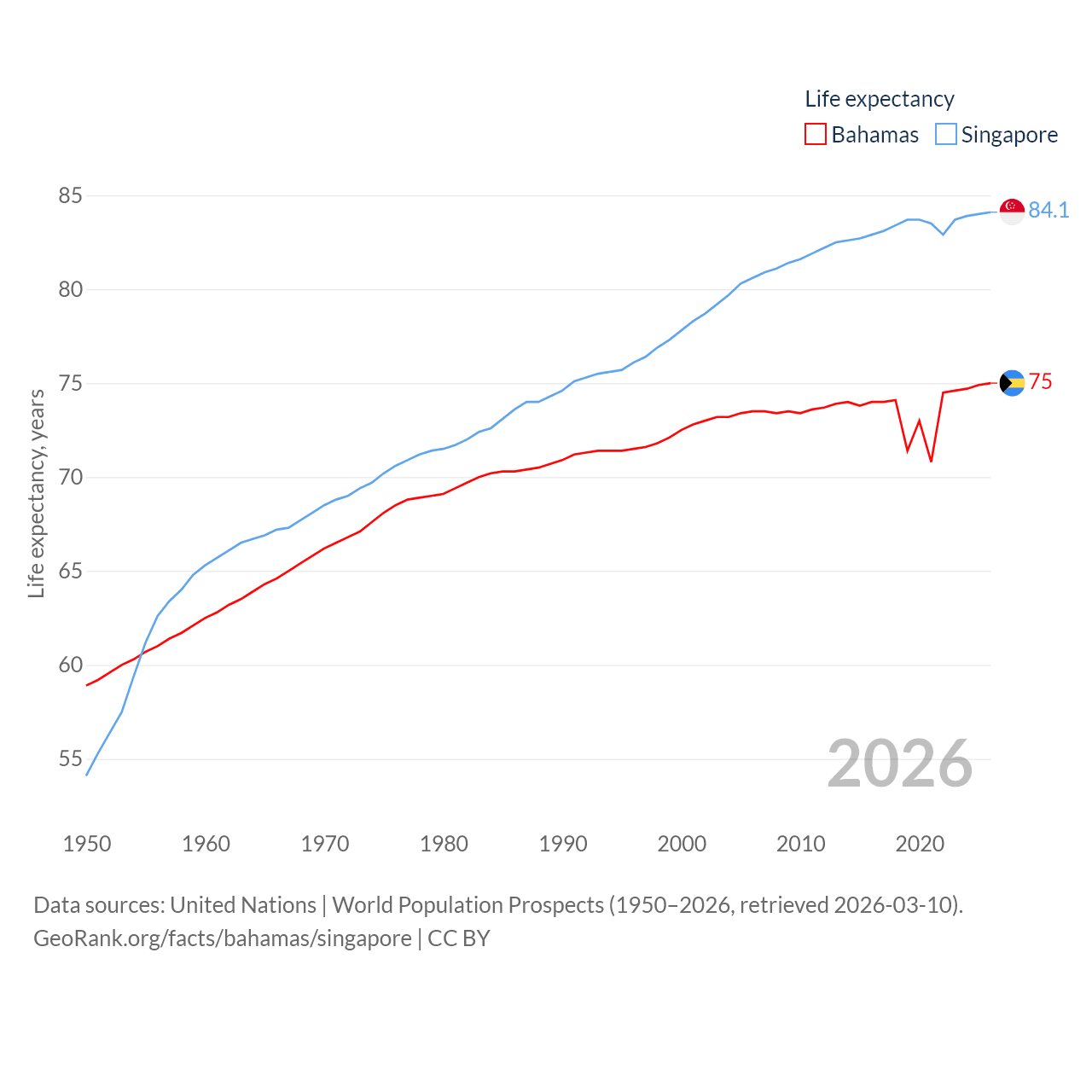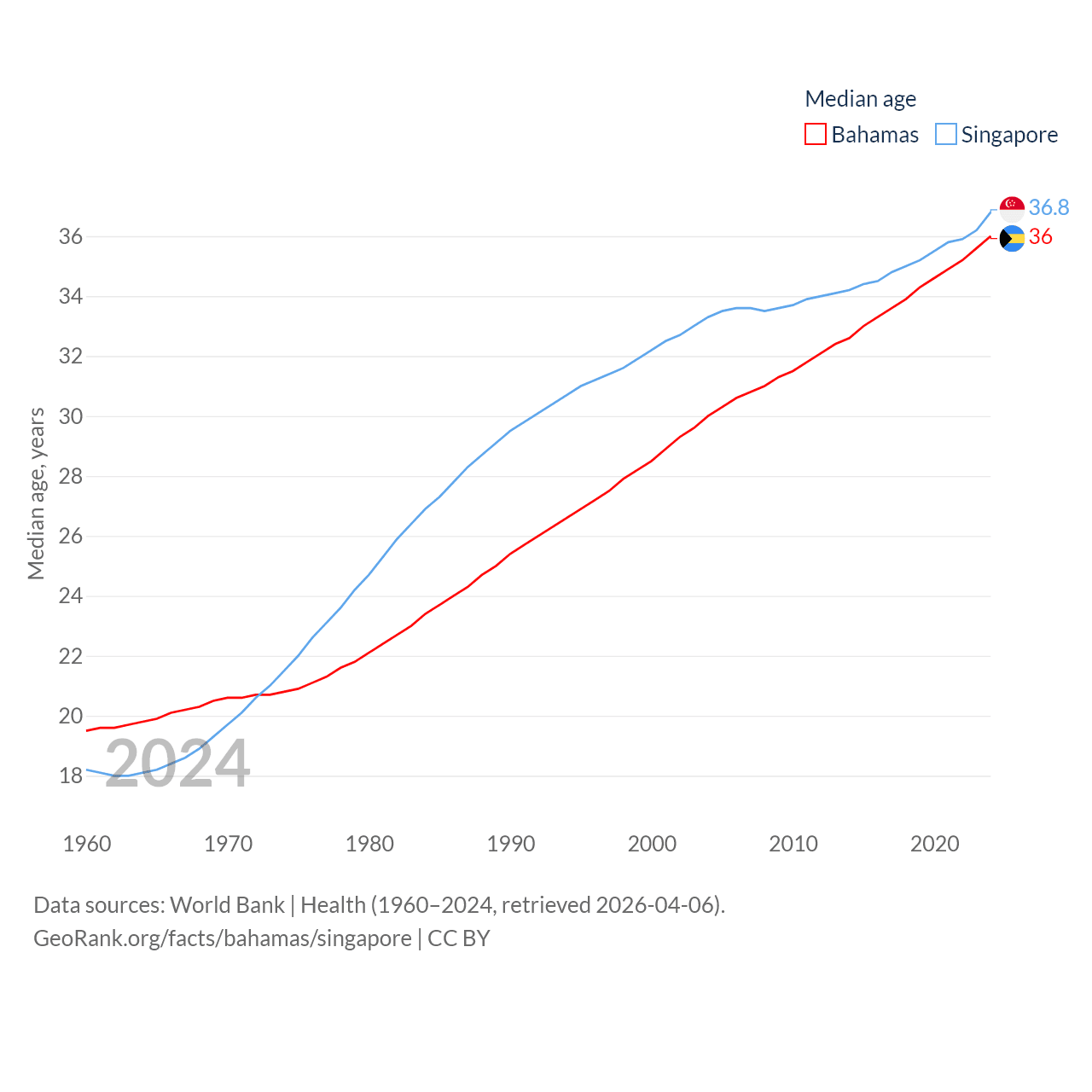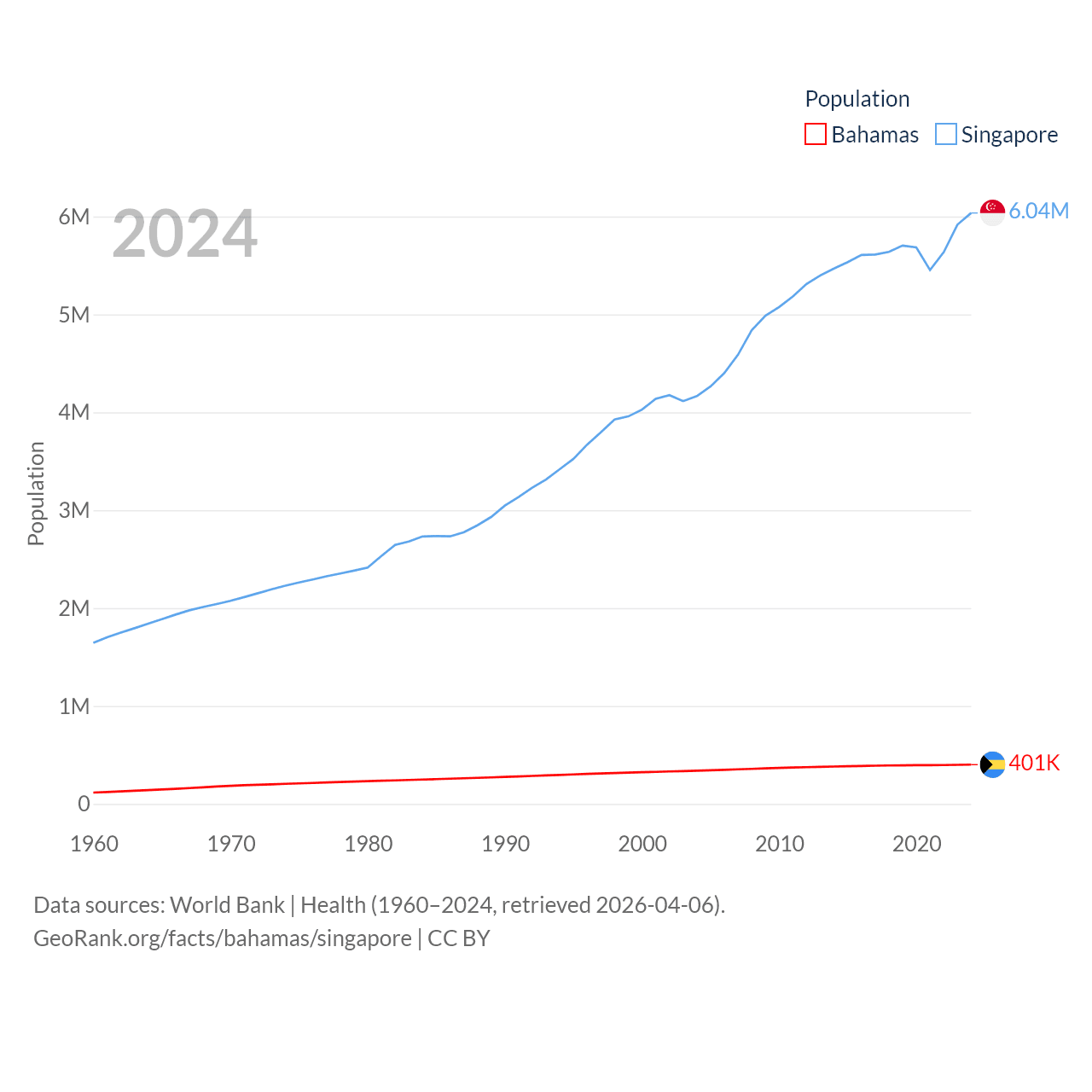 The Bahamas has a population of 401K (ranked 172/197), compared with 6.04M in Singapore (ranked 113/197). The Bahamas' land area is 3,865 sq mi versus 277.2 sq mi for Singapore (ranked 162nd vs. 177th).