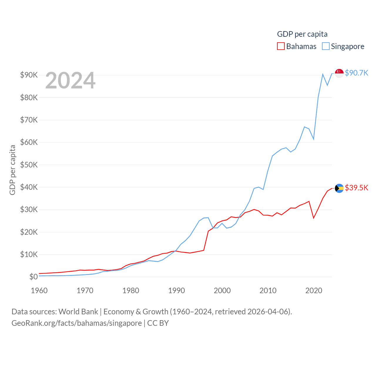 By GDP, The Bahamas ranks 140/197 ($15.8B) and Singapore ranks 28/197 ($547B). By GDP per capita, The Bahamas ranks 30/197 ($39,455), while Singapore ranks 7/197 ($90,674).