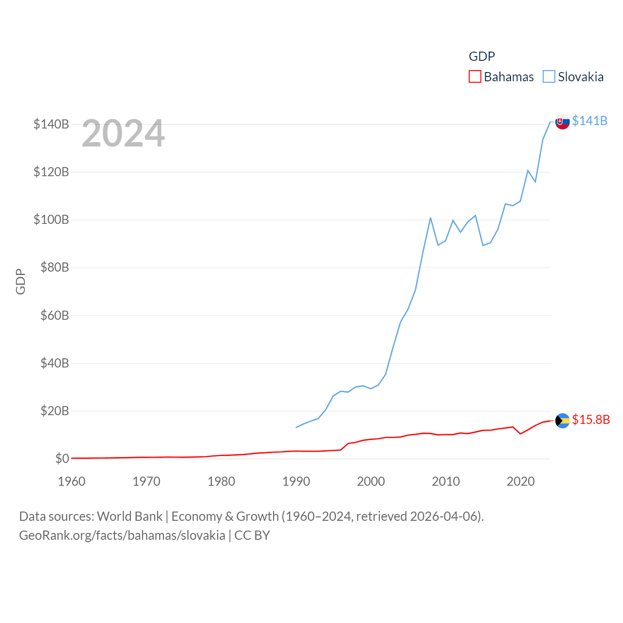 By GDP, The Bahamas ranks 140/197 ($15.8B) and Slovakia ranks 61/197 ($141B). By GDP per capita, The Bahamas ranks 30/197 ($39,455), while Slovakia ranks 47/197 ($25,993).