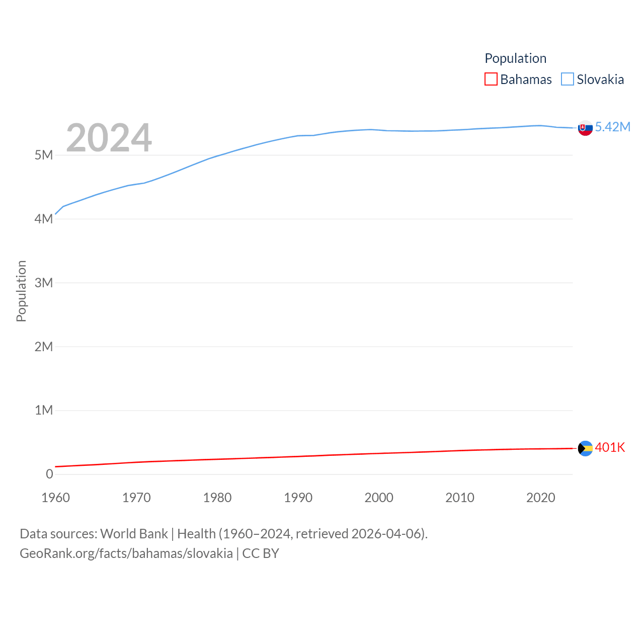 The Bahamas has a population of 401K (ranked 172/197), compared with 5.42M in Slovakia (ranked 119/197). The Bahamas' land area is 3,865 sq mi versus 18,564 sq mi for Slovakia (ranked 162nd vs. 128th).