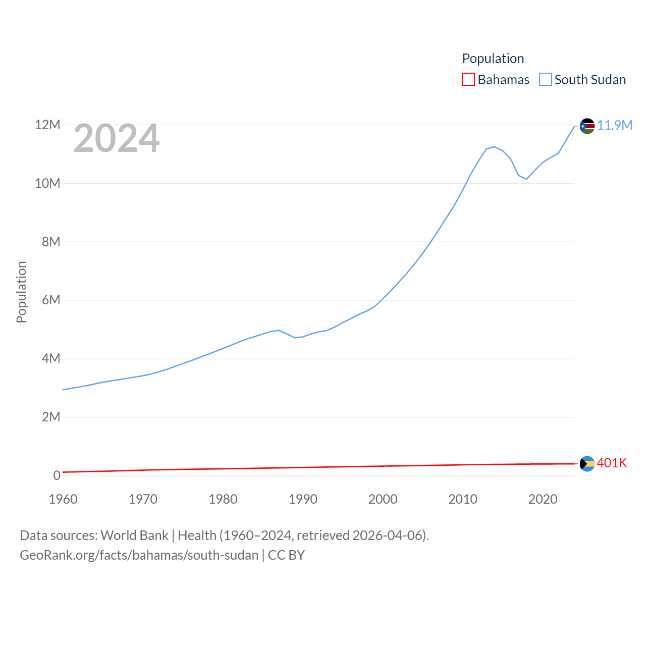 The Bahamas has a population of 401K (ranked 172/197), compared with 11.9M in South Sudan (ranked 81/197). The Bahamas' land area is 3,865 sq mi versus 243,990 sq mi for South Sudan (ranked 162nd vs. 41st).