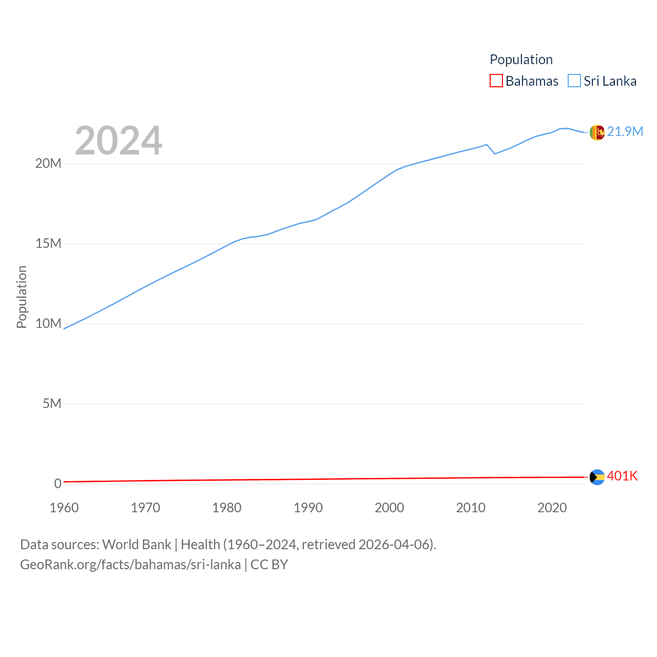 The Bahamas has a population of 401K (ranked 172/197), compared with 21.9M in Sri Lanka (ranked 61/197). The Bahamas' land area is 3,865 sq mi versus 23,884 sq mi for Sri Lanka (ranked 162nd vs. 122nd).