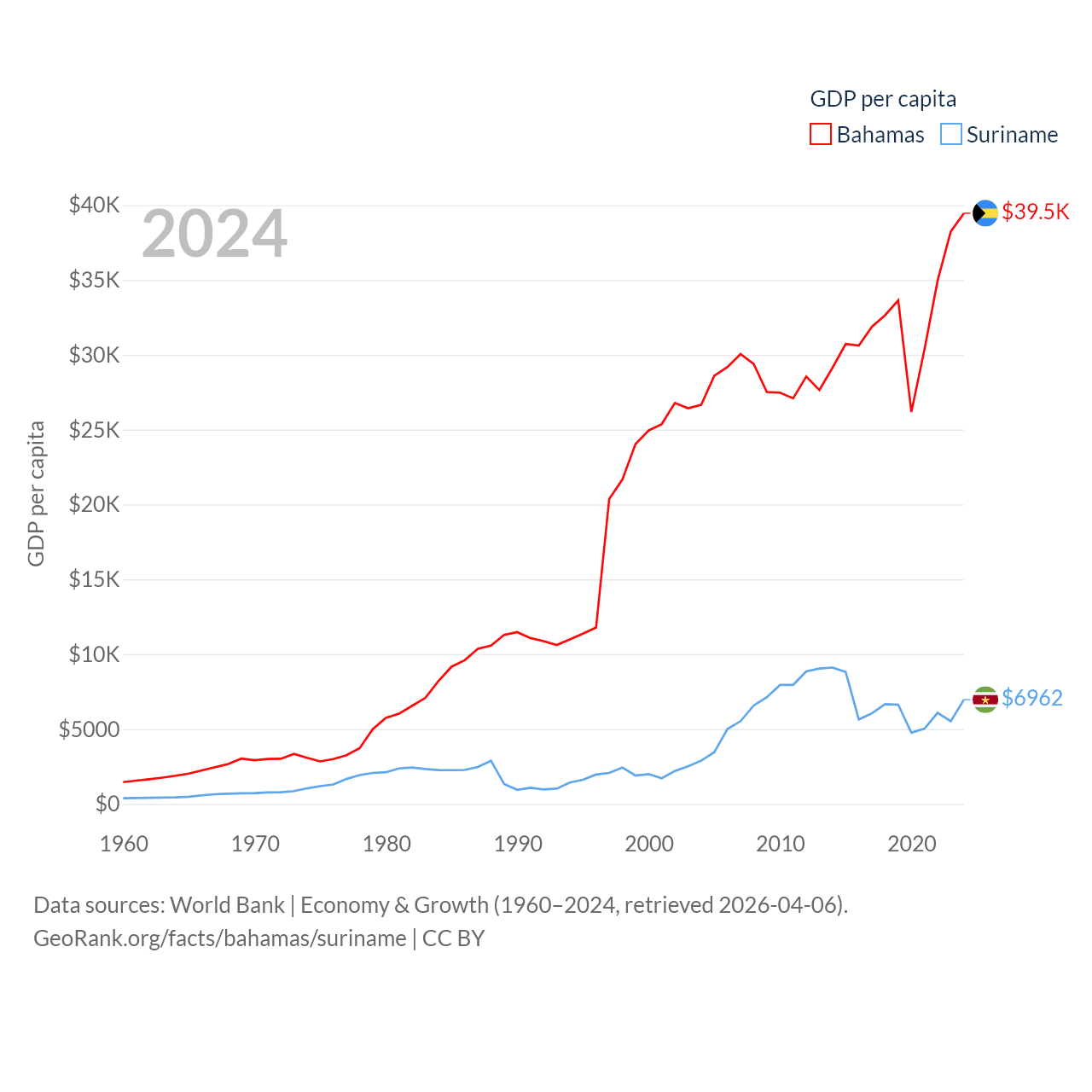 By GDP, The Bahamas ranks 140/197 ($15.8B) and Suriname ranks 164/197 ($4.42B). By GDP per capita, The Bahamas ranks 30/197 ($39,455), while Suriname ranks 102/197 ($6,962).