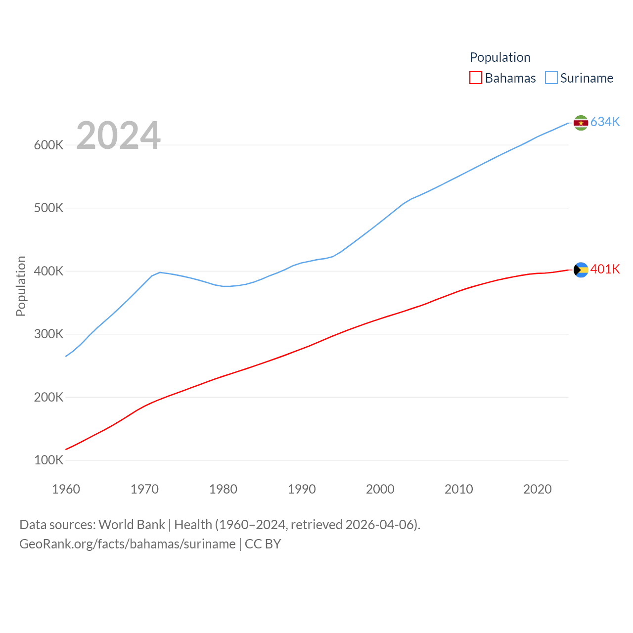 The Bahamas has a population of 401K (ranked 172/197), compared with 634K in Suriname (ranked 165/197). The Bahamas' land area is 3,865 sq mi versus 61,972 sq mi for Suriname (ranked 162nd vs. 90th).