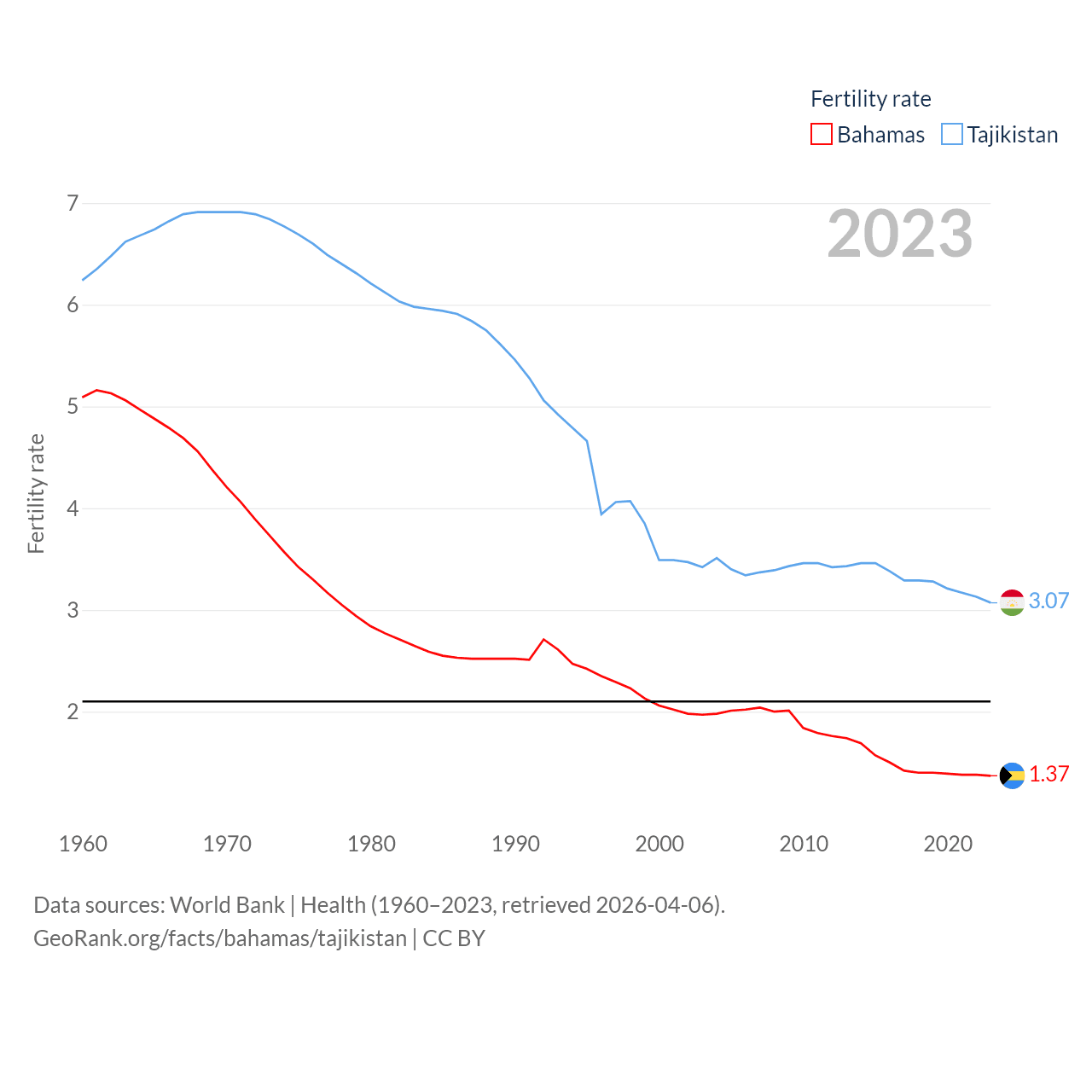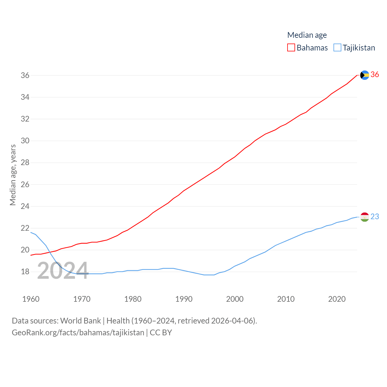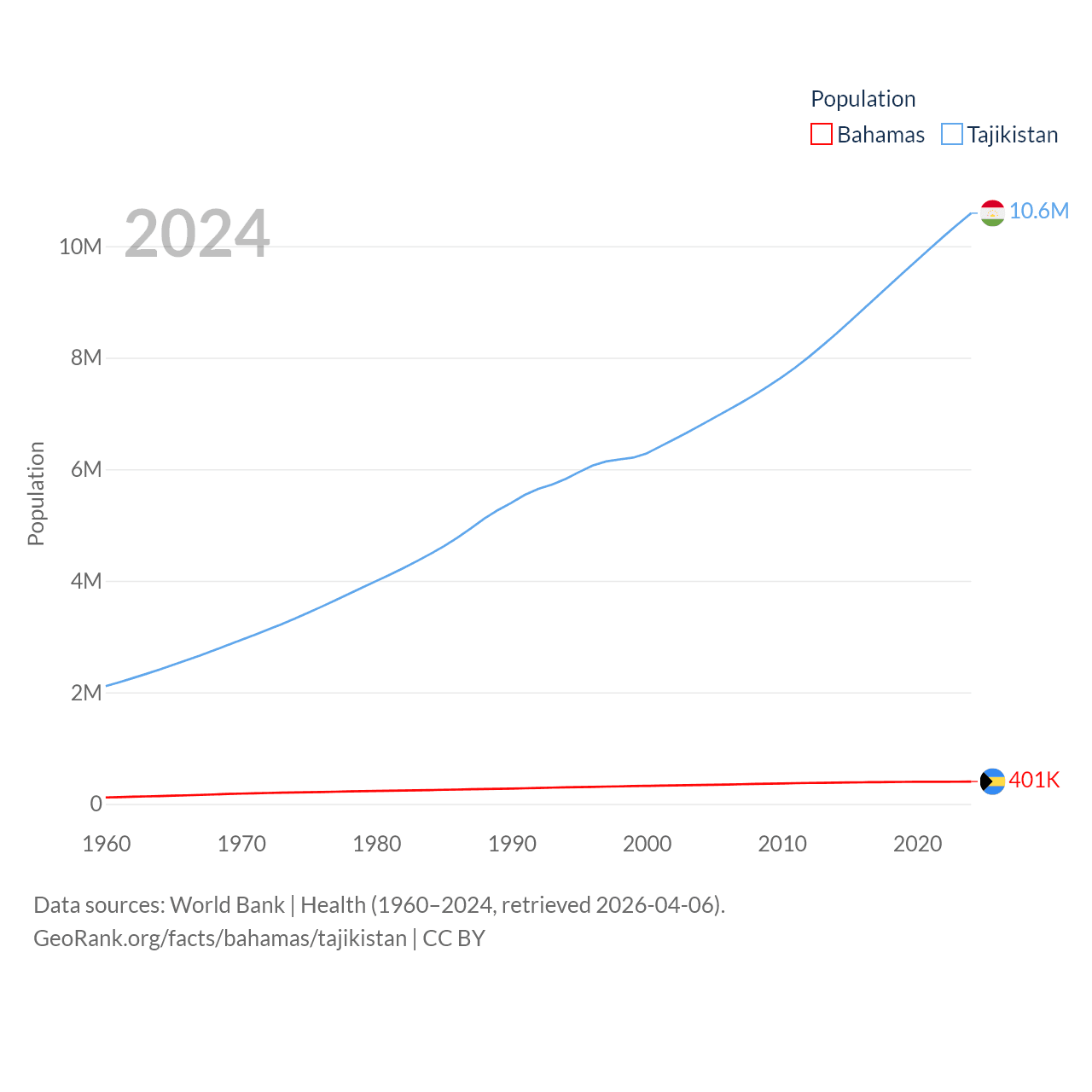 The Bahamas has a population of 401K (ranked 172/197), compared with 10.6M in Tajikistan (ranked 91/197). The Bahamas' land area is 3,865 sq mi versus 53,587 sq mi for Tajikistan (ranked 162nd vs. 93rd).