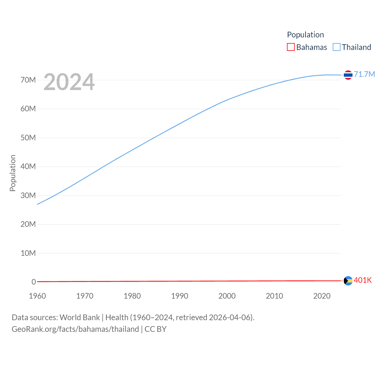 The Bahamas has a population of 401K (ranked 172/197), compared with 71.7M in Thailand (ranked 20/197). The Bahamas' land area is 3,865 sq mi versus 197,256 sq mi for Thailand (ranked 162nd vs. 50th).