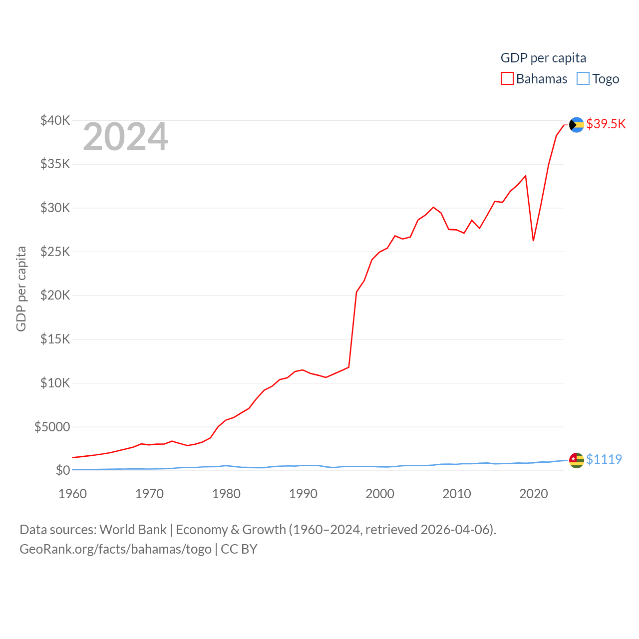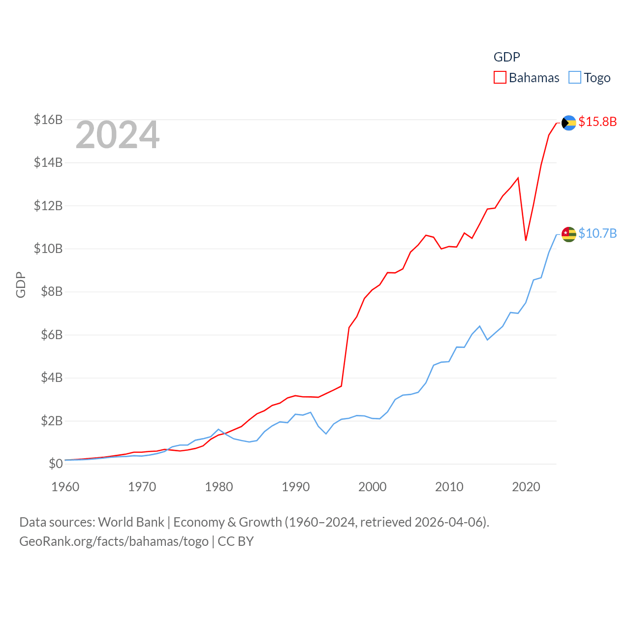 By GDP, The Bahamas ranks 140/197 ($15.8B) and Togo ranks 154/197 ($10.7B). By GDP per capita, The Bahamas ranks 30/197 ($39,455), while Togo ranks 172/197 ($1,119).