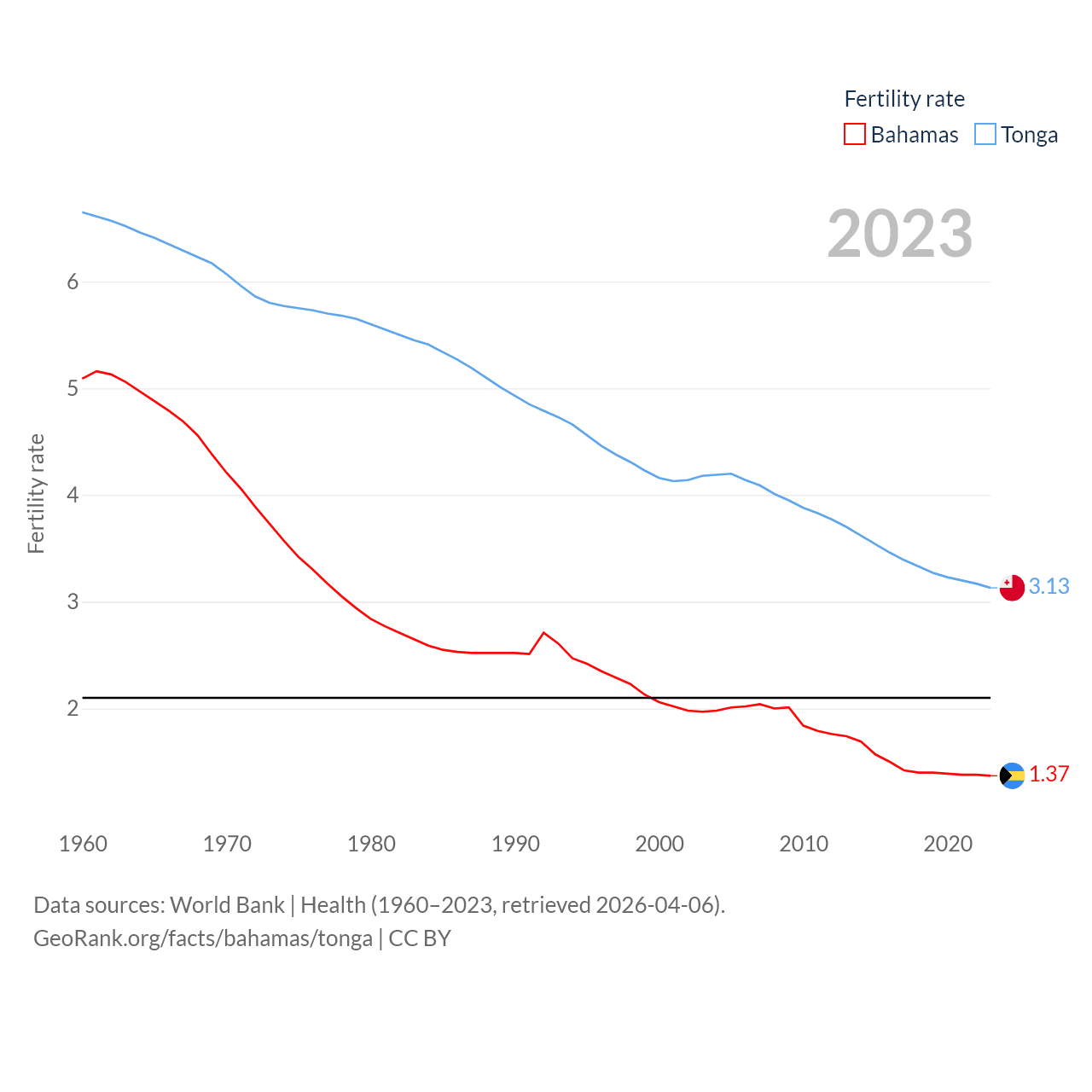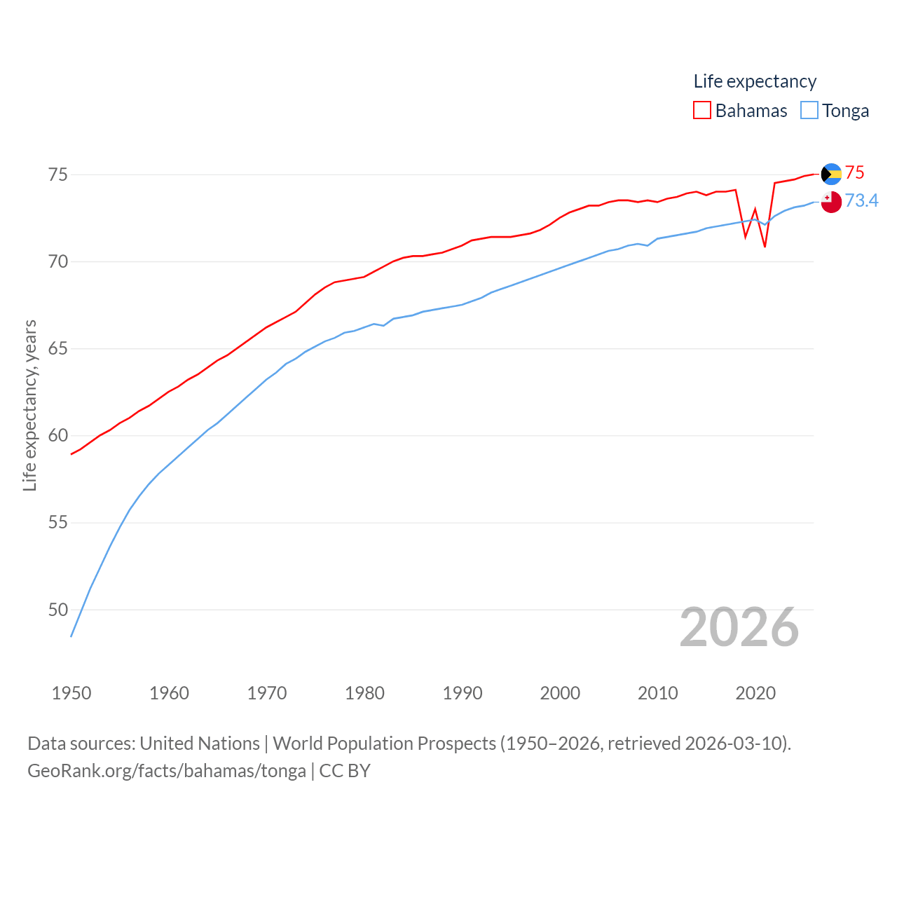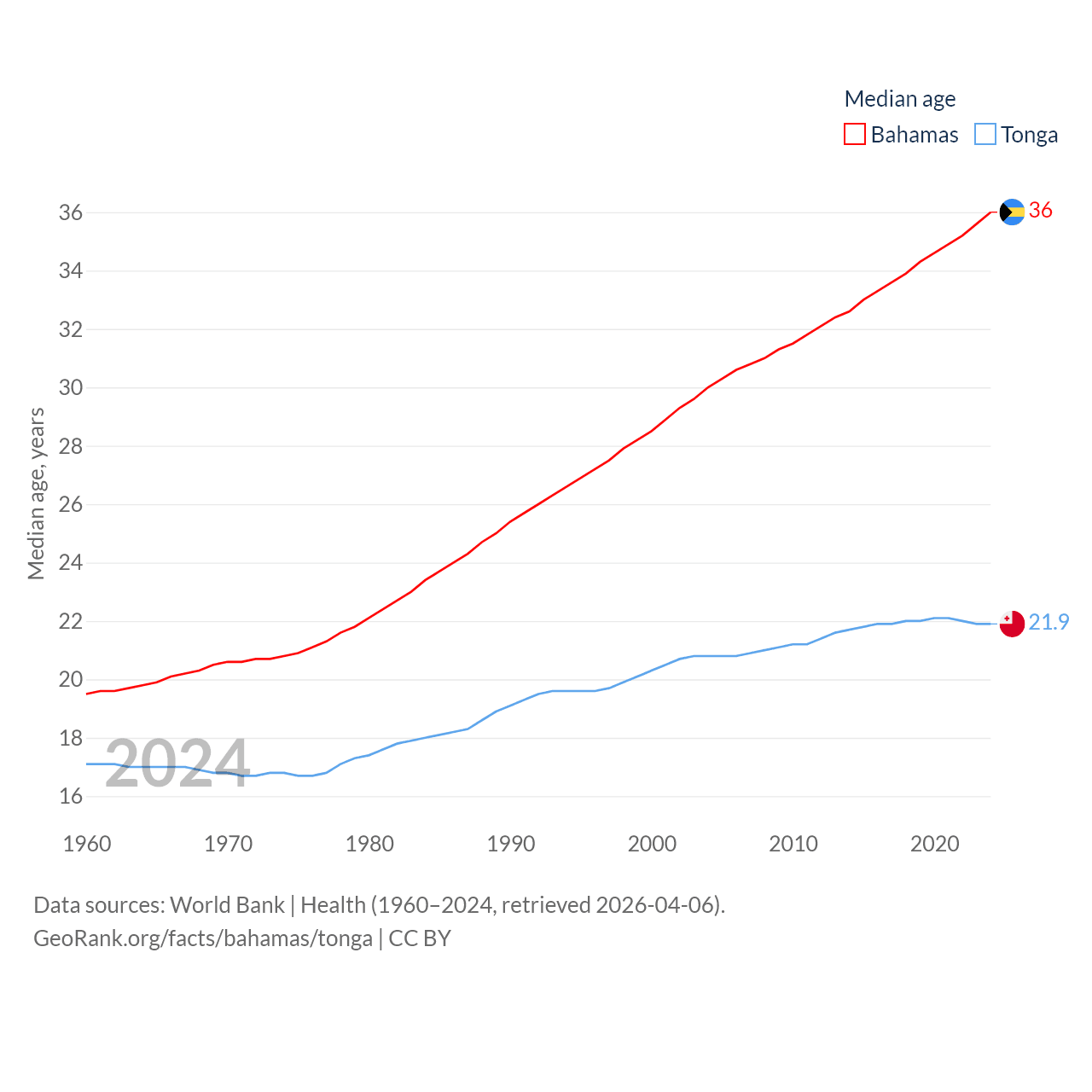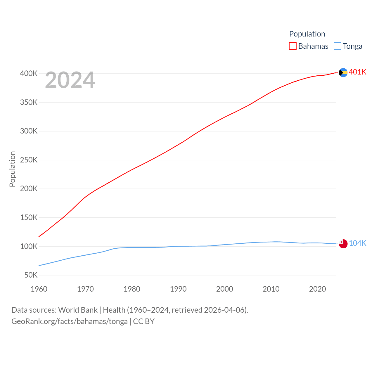 The Bahamas has a population of 401K (ranked 172/197), compared with 104K in Tonga (ranked 183/197). The Bahamas' land area is 3,865 sq mi versus 278 sq mi for Tonga (ranked 162nd vs. 176th).