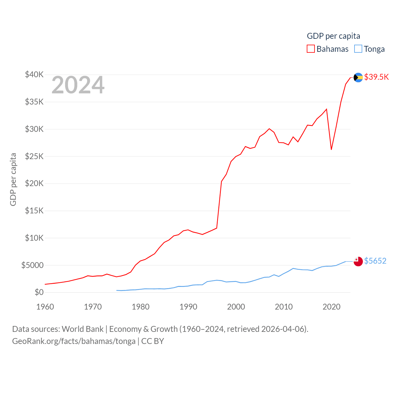 By GDP, The Bahamas ranks 140/197 ($15.8B) and Tonga ranks 191/197 ($591M). By GDP per capita, The Bahamas ranks 30/197 ($39,455), while Tonga ranks 115/197 ($5,652).