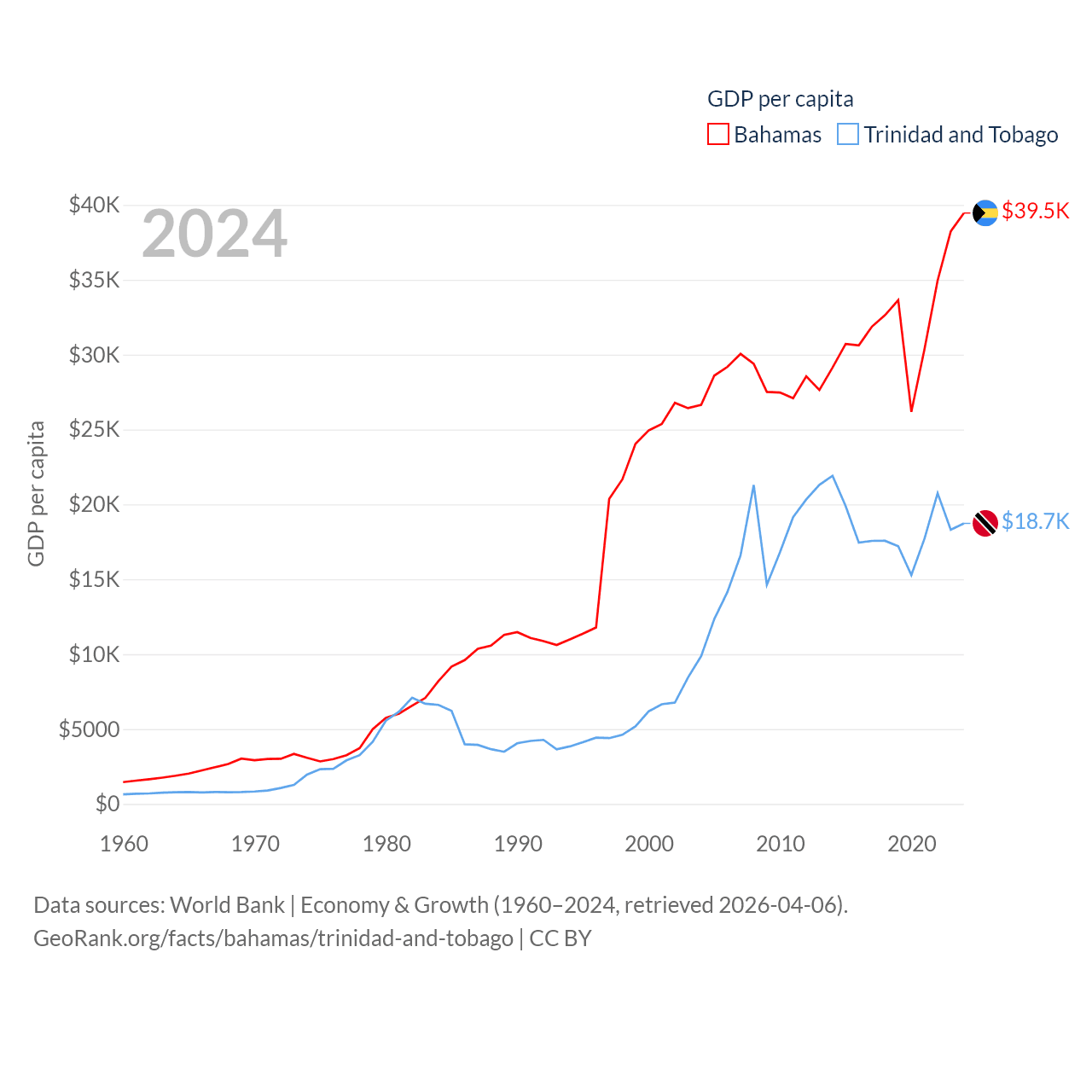 By GDP, The Bahamas ranks 140/197 ($15.8B) and Trinidad and Tobago ranks 115/197 ($25.6B). By GDP per capita, The Bahamas ranks 30/197 ($39,455), while Trinidad and Tobago ranks 61/197 ($18,733).