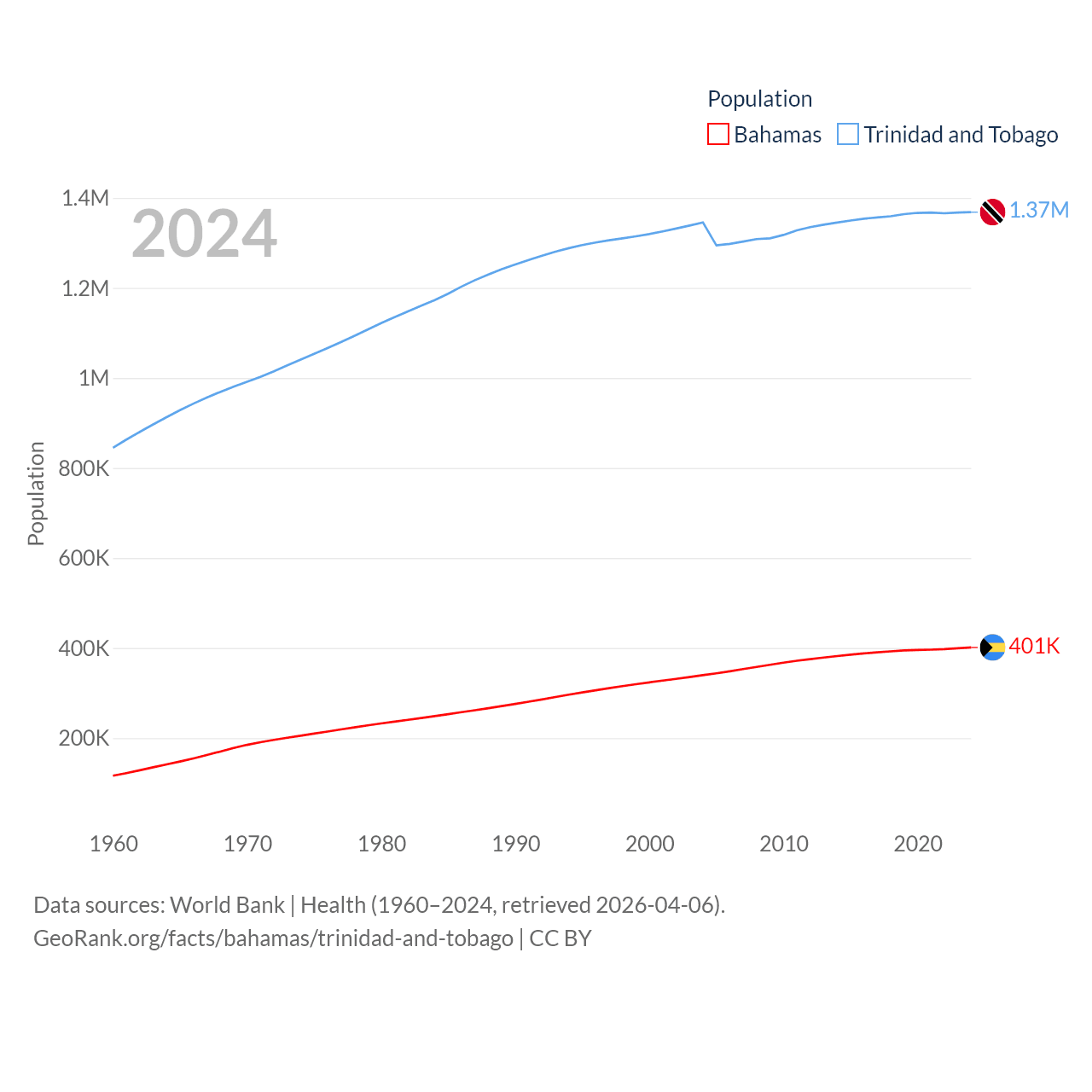 The Bahamas has a population of 401K (ranked 172/197), compared with 1.37M in Trinidad and Tobago (ranked 154/197). The Bahamas' land area is 3,865 sq mi versus 1,981 sq mi for Trinidad and Tobago (ranked 162nd vs. 166th).