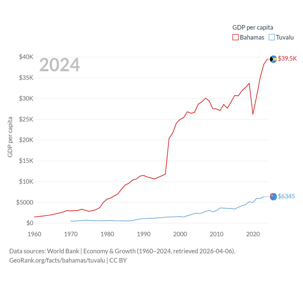 By GDP, The Bahamas ranks 140/197 ($15.8B) and Tuvalu ranks 196/197 ($62.3M). By GDP per capita, The Bahamas ranks 30/197 ($39,455), while Tuvalu ranks 110/197 ($6,345).