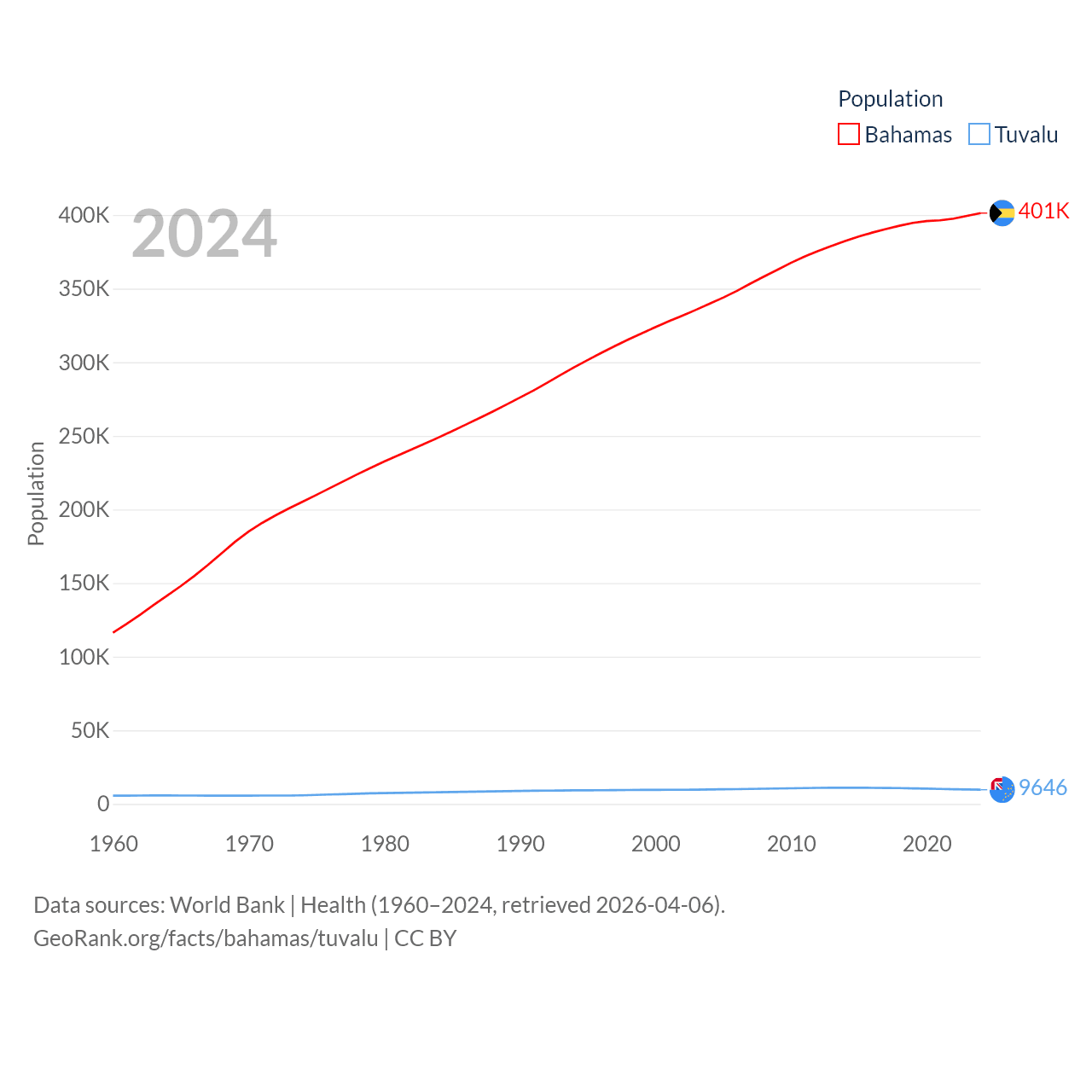 The Bahamas has a population of 401K (ranked 172/197), compared with 9.65K in Tuvalu (ranked 196/197). The Bahamas' land area is 3,865 sq mi versus 11.6 sq mi for Tuvalu (ranked 162nd vs. 194th).