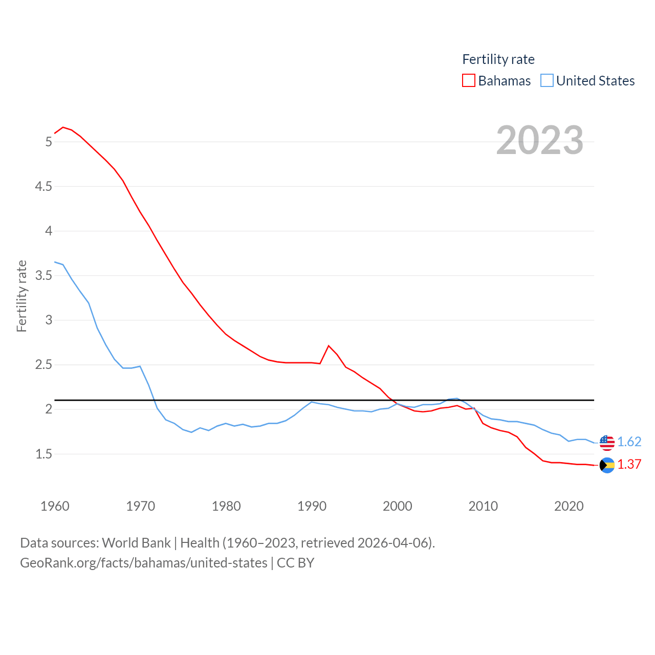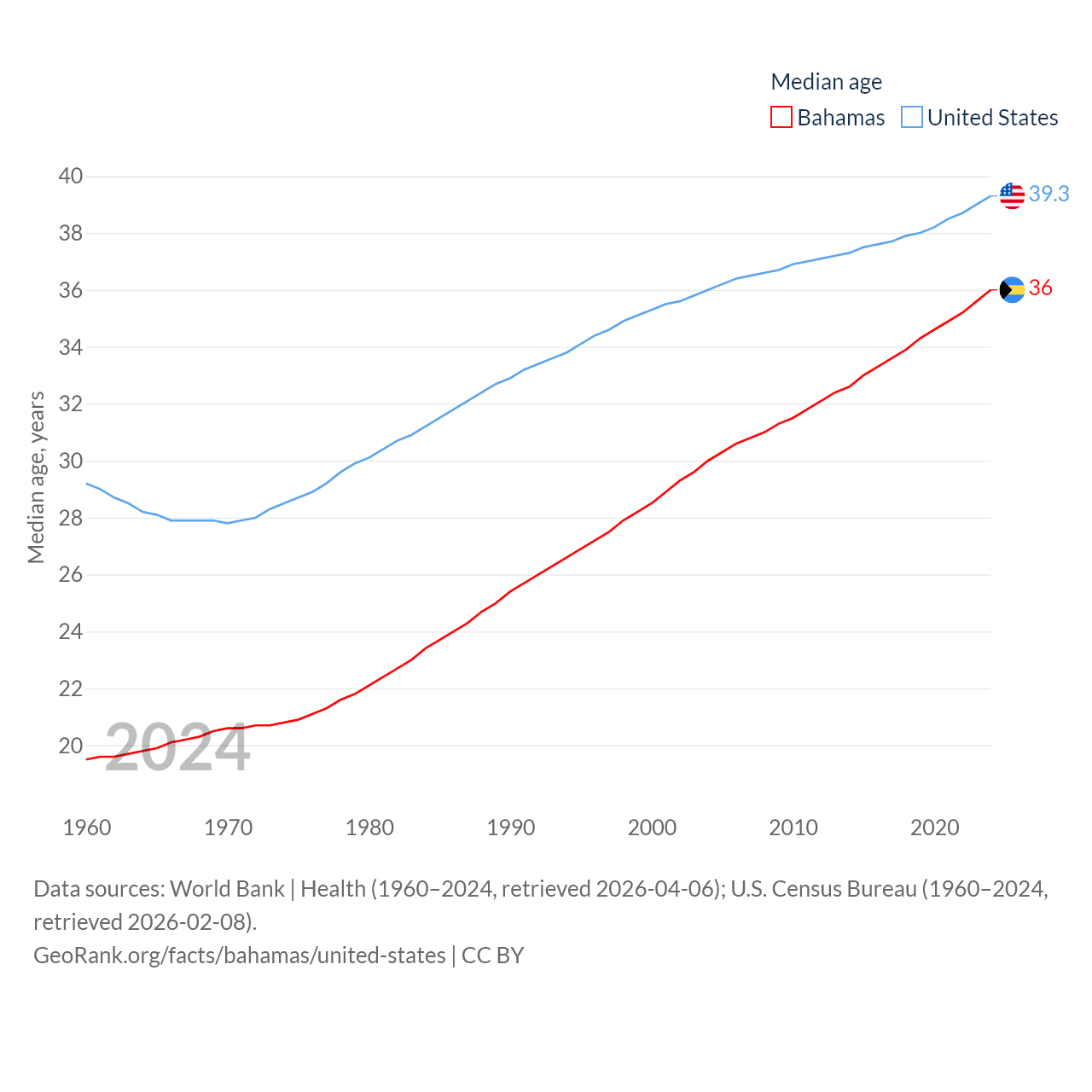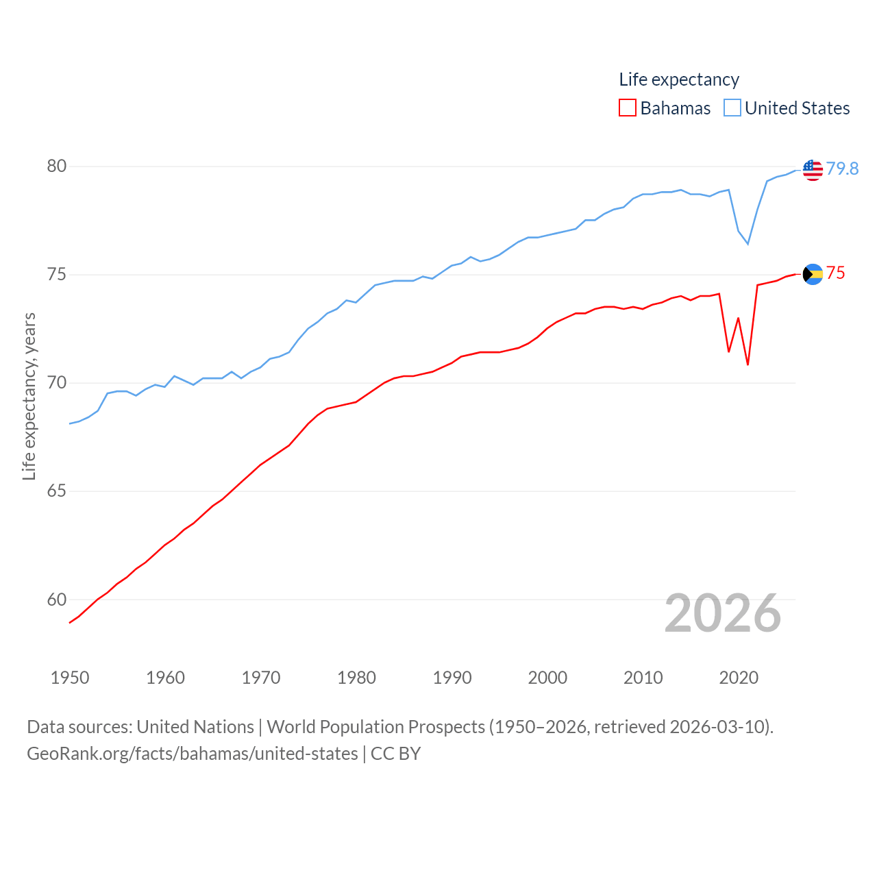 The Bahamas has a population of 401K (ranked 172/197), compared with 342M in The United States (ranked 3/197). The Bahamas' land area is 3,865 sq mi versus 3,531,839 sq mi for The United States (ranked 162nd vs. 3rd).