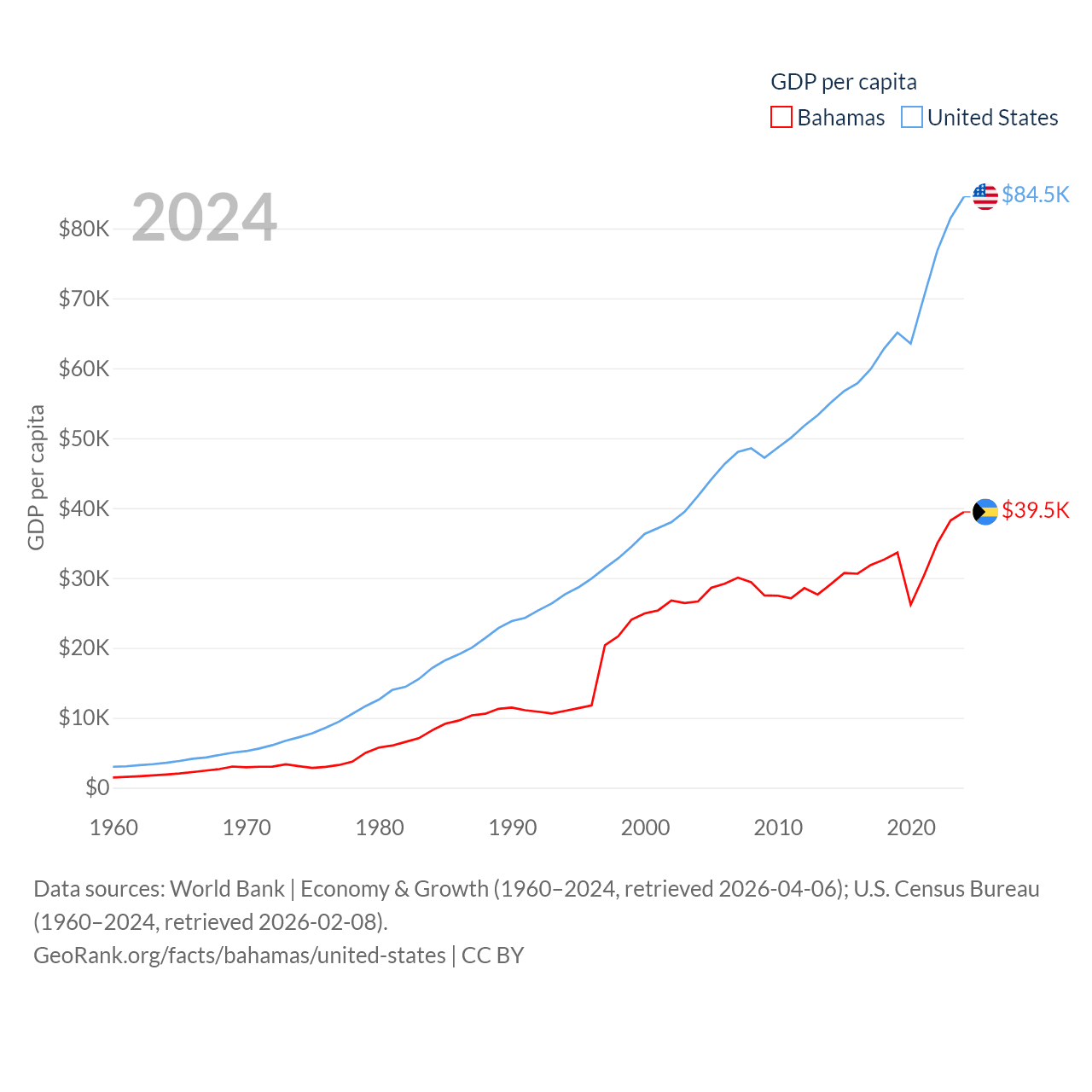By GDP, The Bahamas ranks 140/197 ($15.8B) and The United States ranks 1/197 ($28.8T). By GDP per capita, The Bahamas ranks 30/197 ($39,455), while The United States ranks 10/197 ($84,534).