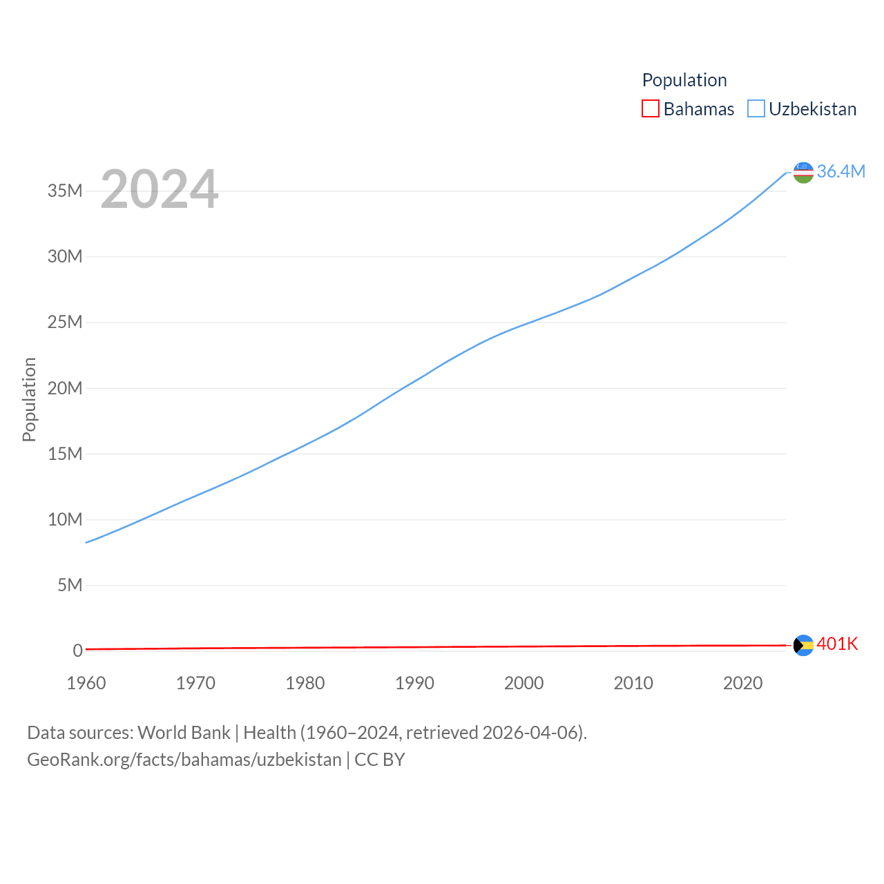 The Bahamas has a population of 401K (ranked 172/197), compared with 36.4M in Uzbekistan (ranked 43/197). The Bahamas' land area is 3,865 sq mi versus 170,136 sq mi for Uzbekistan (ranked 162nd vs. 56th).