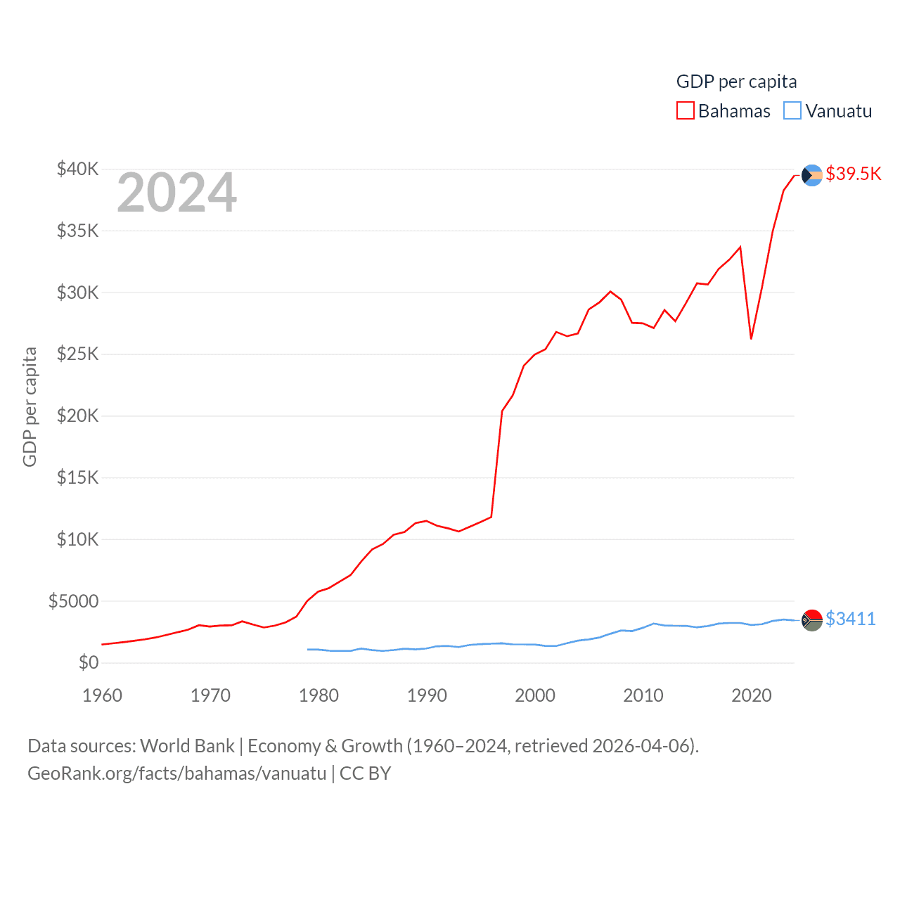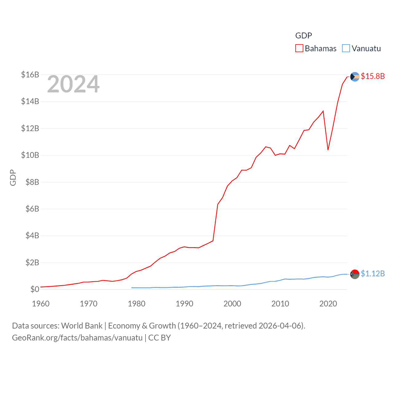 By GDP, The Bahamas ranks 140/197 ($15.8B) and Vanuatu ranks 188/197 ($1.12B). By GDP per capita, The Bahamas ranks 30/197 ($39,455), while Vanuatu ranks 137/197 ($3,411).