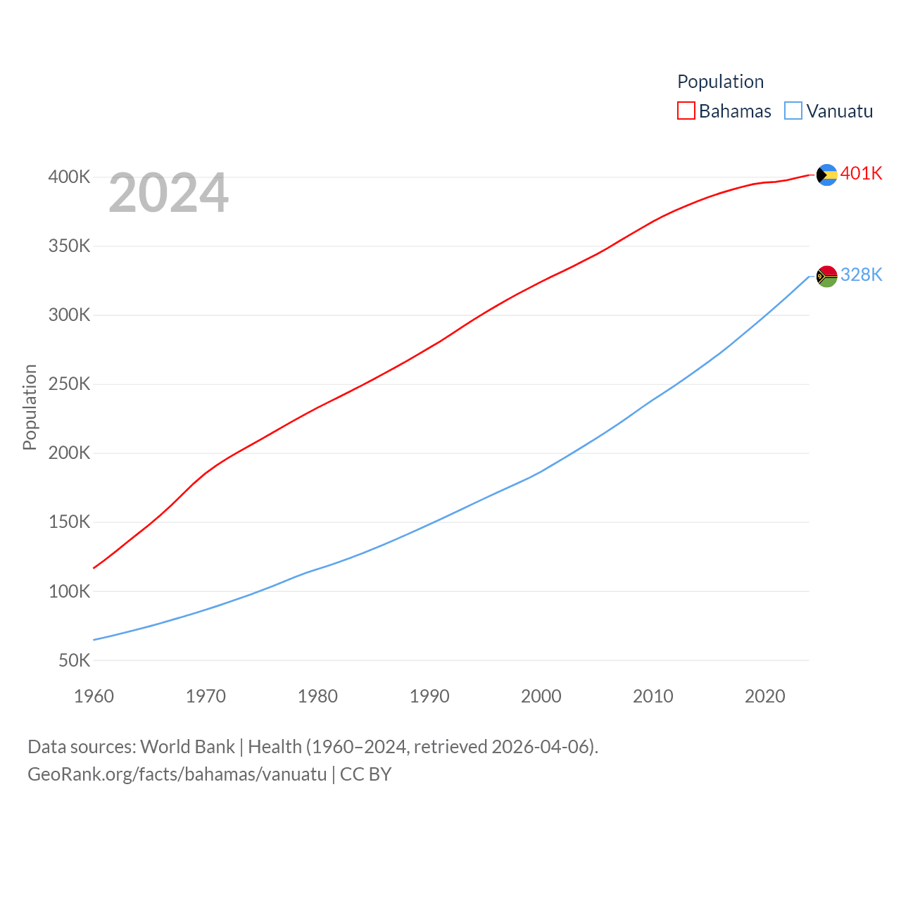 The Bahamas has a population of 401K (ranked 172/197), compared with 328K in Vanuatu (ranked 174/197). The Bahamas' land area is 3,865 sq mi versus 4,707 sq mi for Vanuatu (ranked 162nd vs. 157th).